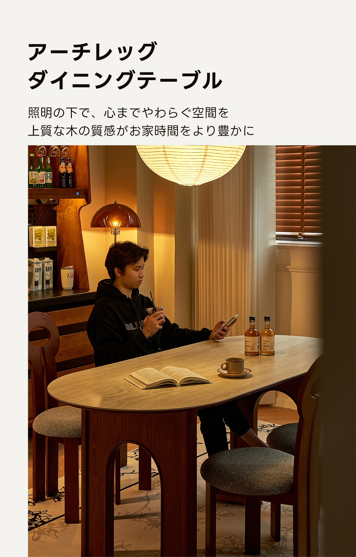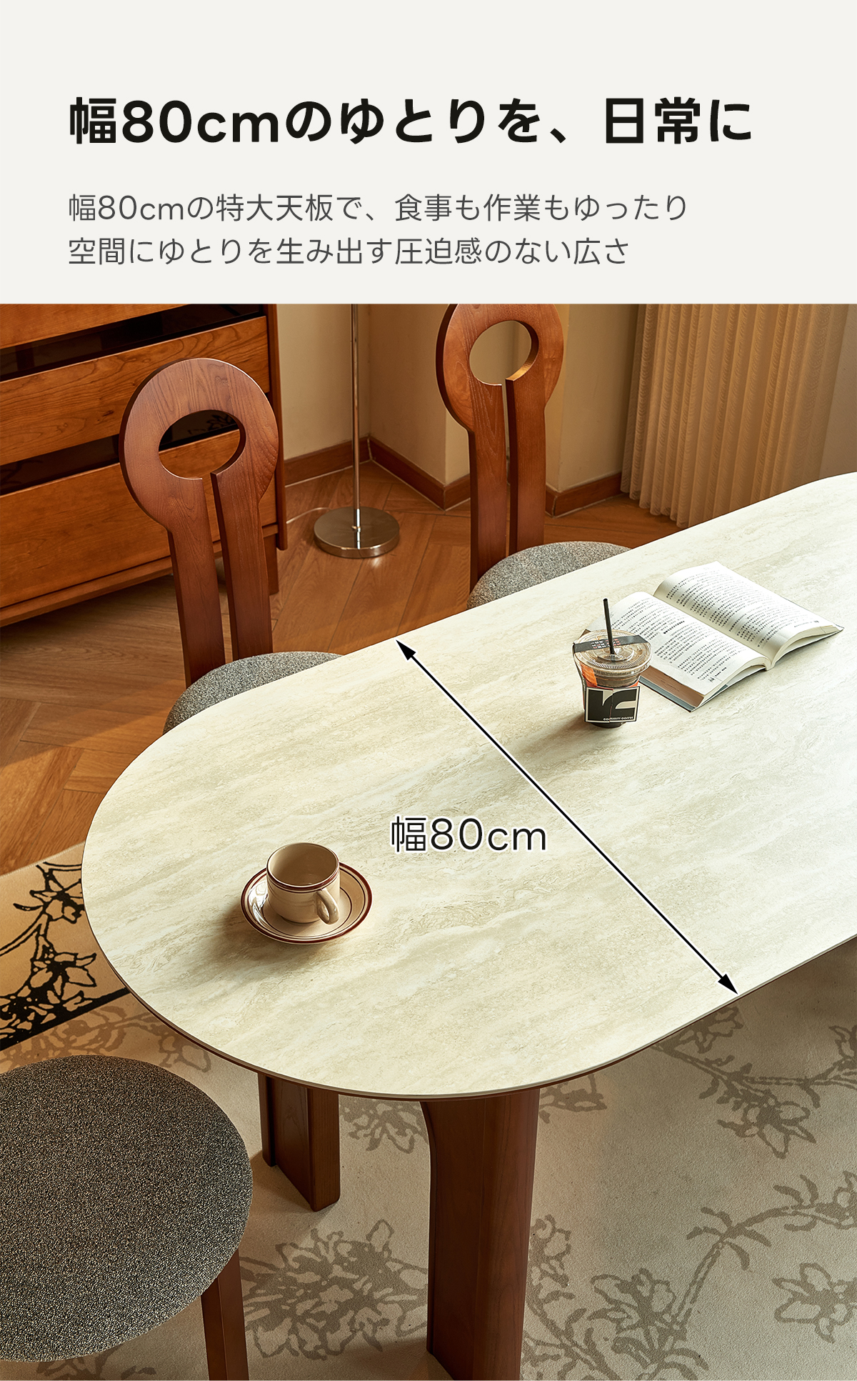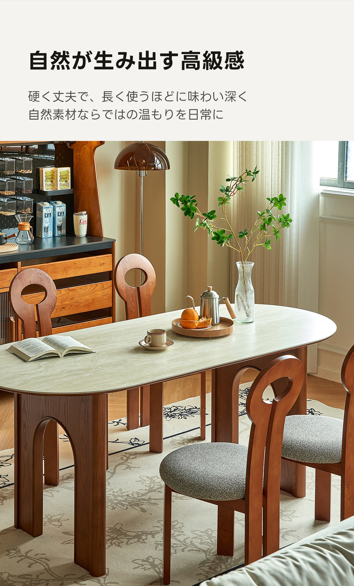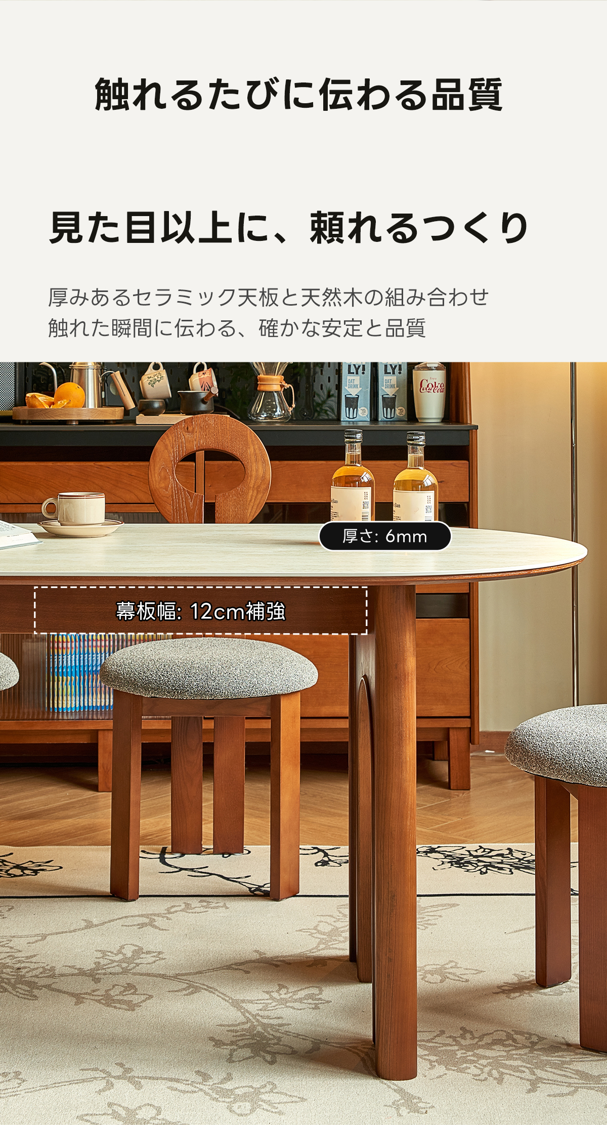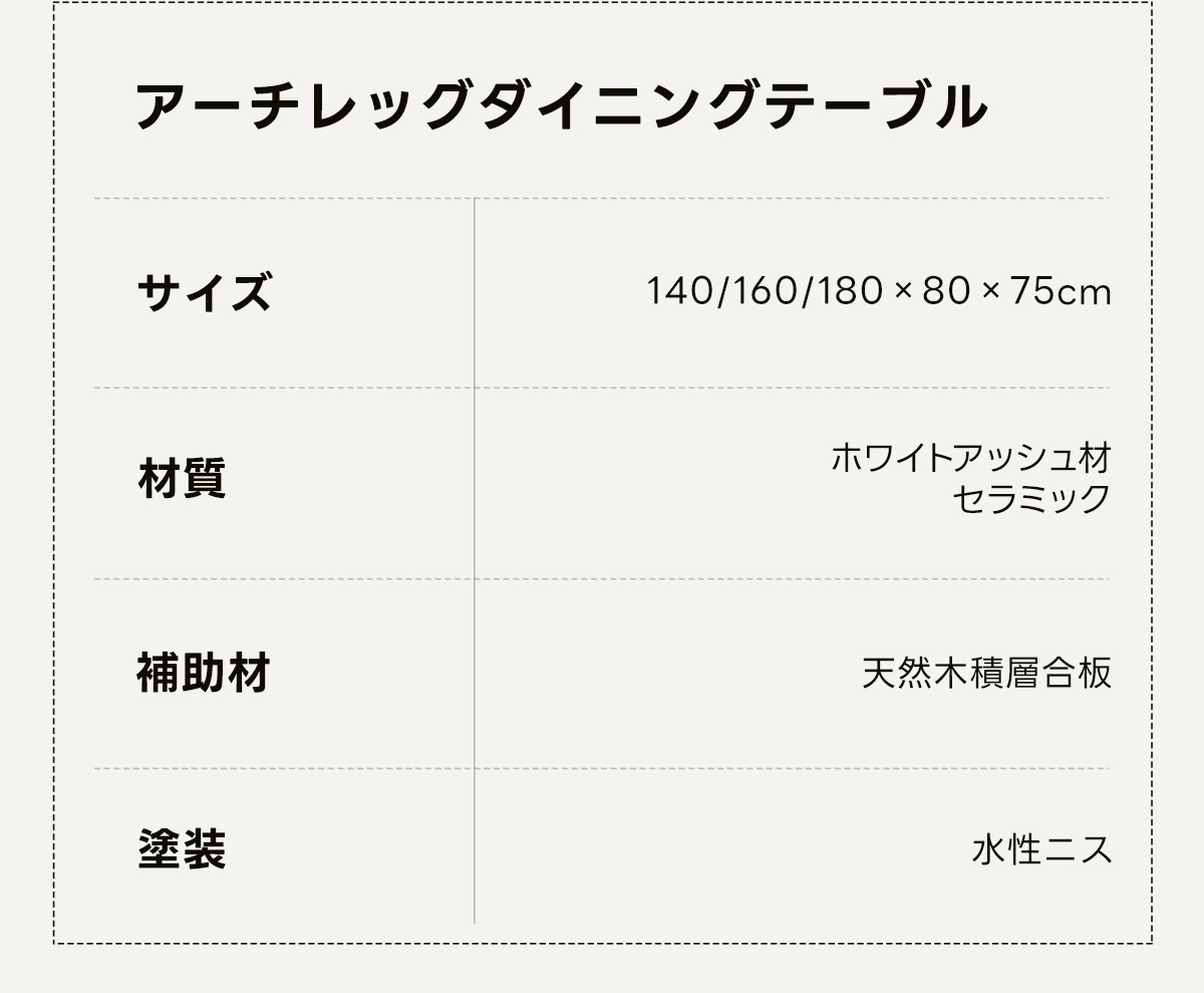 - 【自然な温もりと高品質素材】ホワイトアッシュ材とセラミックの組み合わせが、自然な温もりと高級感を提供します。アーチ型の脚部デザインが空間に奥行きを加え、視覚的にも魅力的です。低刺激の水性ニス塗装が施されており、安心して使用できます。