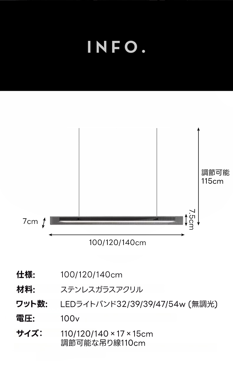- 【多様なダイニングスペースに対応】110cm、120cm、140cmの3つのサイズバリエーションがあり、様々なダイニングスペースに対応可能です。調節可能な吊り線(最大110cm)で、天井の高さに合わせて最適な位置に設置できます。