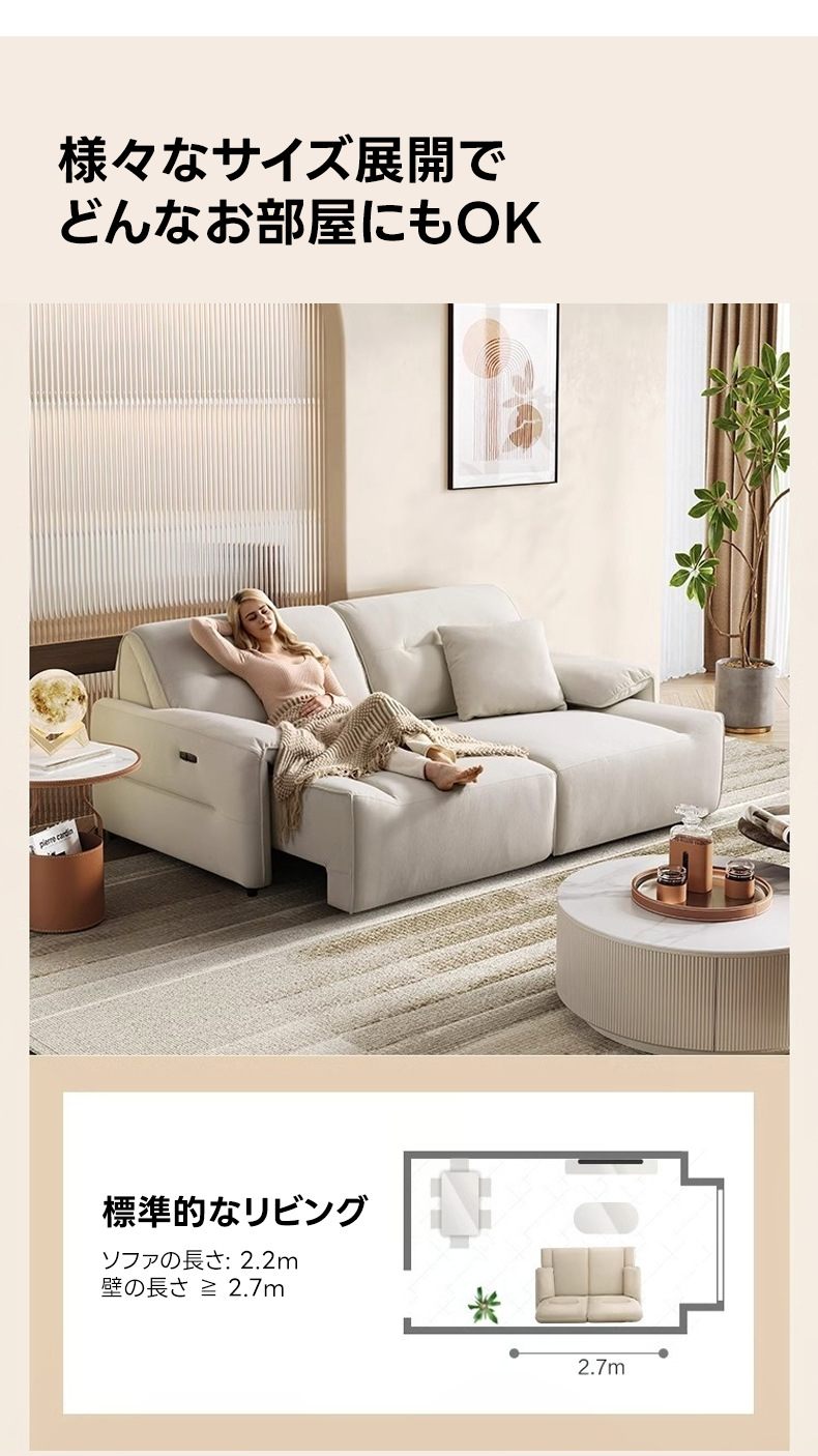 - 【電動リクライニング機能】このソファは、ワンタッチでソファ、カウチ、ベッドの3WAYに切り替え可能です。電動リクライニング機能により、リラックスした時間を提供し、快適な座り心地を実現します。ハイパワーモーター搭載で、スムーズな動作を保証し、静音設計で省エネにも配慮されています。