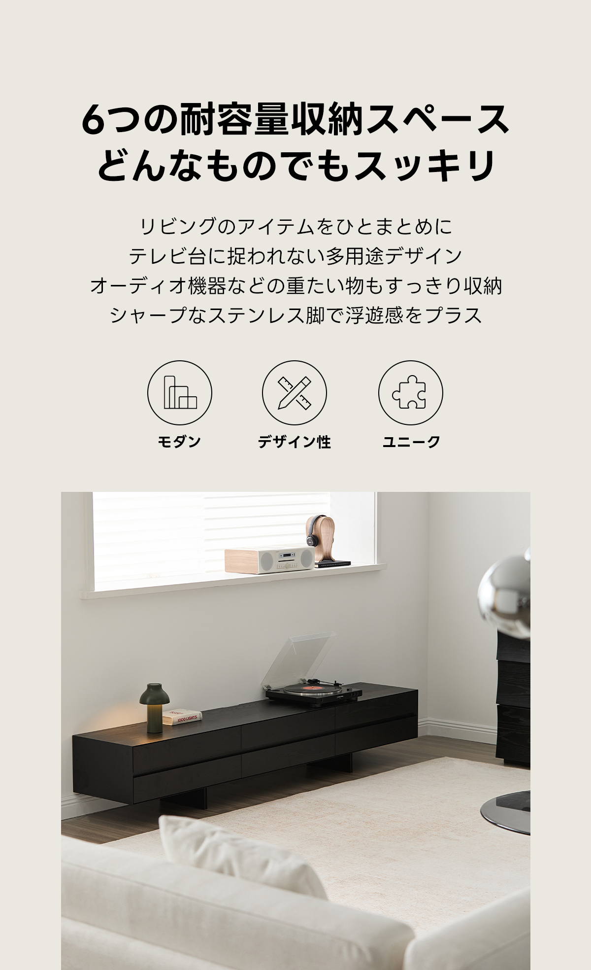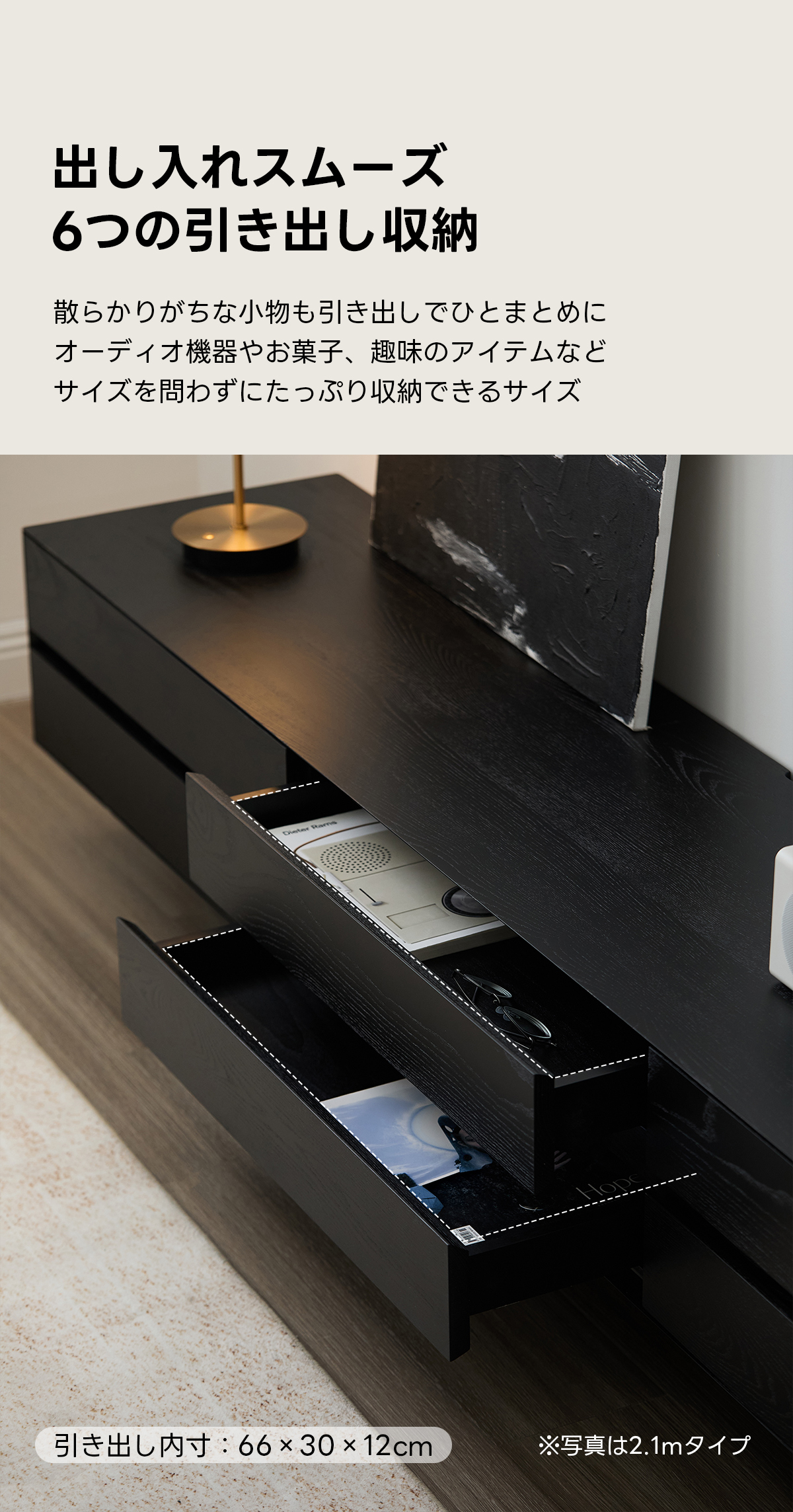 - 【多機能収納】6つの引き出しを備えたこのテレビボードは、リビングの小物やオーディオ機器をすっきりと収納できます。ダンピング式スライドレールを採用し、静音機能で開閉がスムーズです。
