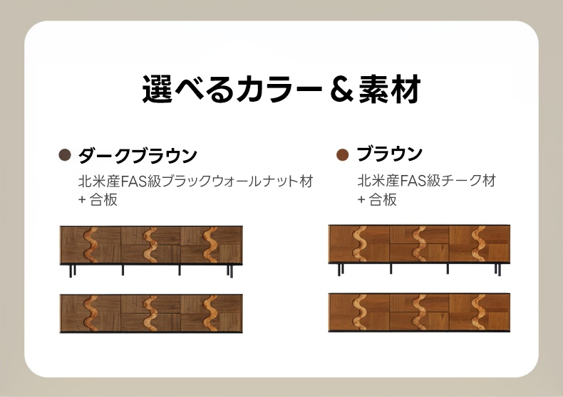 - 【高級素材と優れた品質】北米産FAS級のブラックウォールナット材やチーク材を使用し、高級感を演出。ブラウンとダークブラウンの2色展開で、お部屋の雰囲気に合わせて選べます。