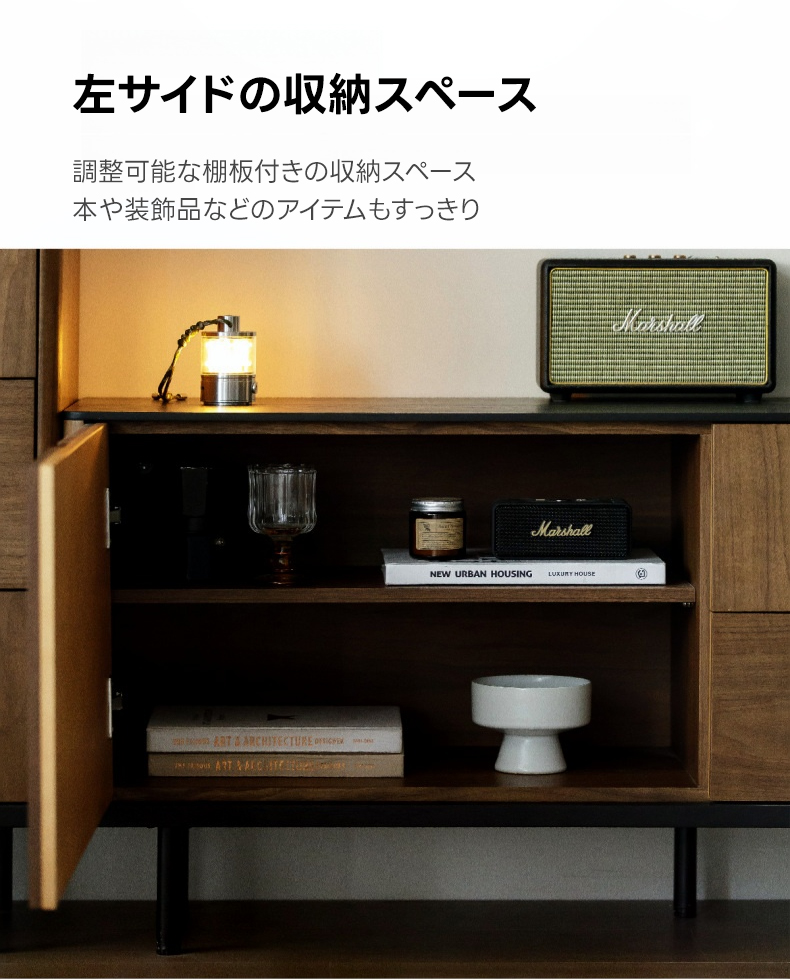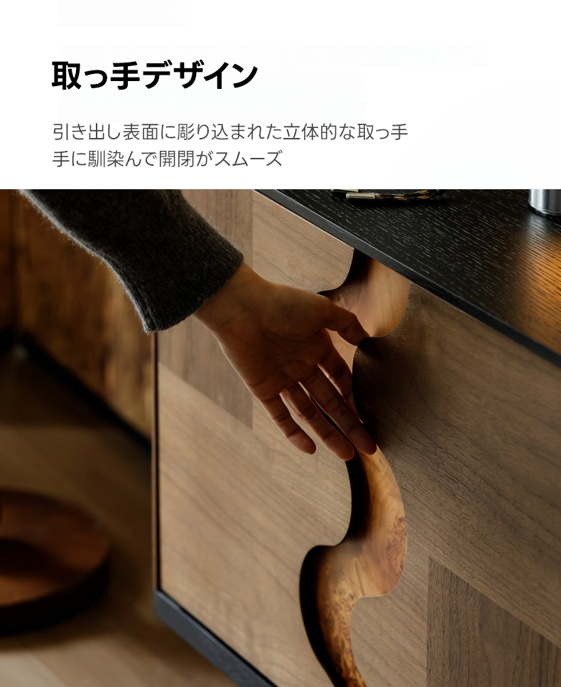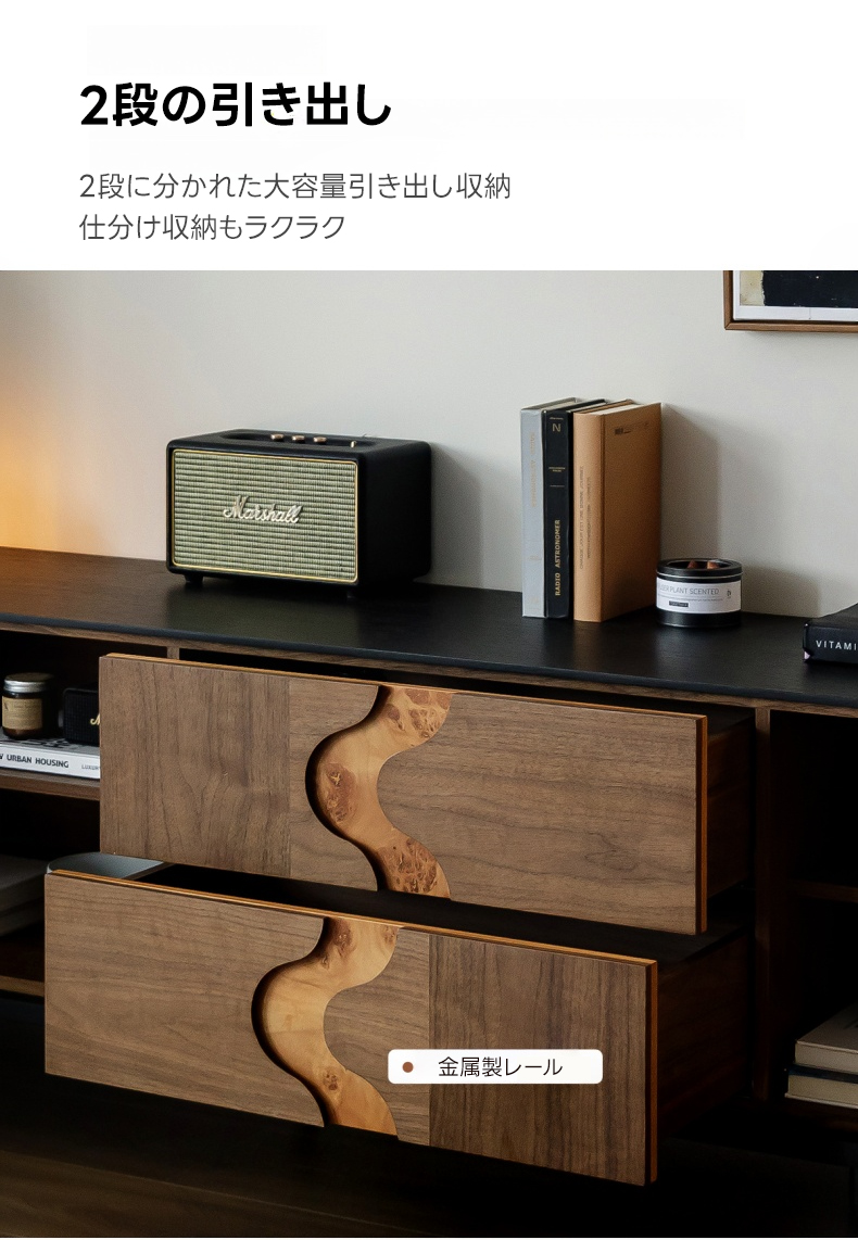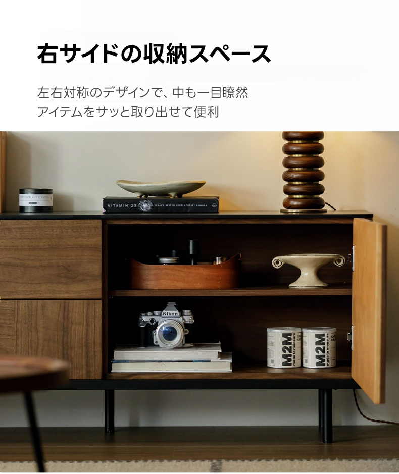 - 【便利な収納力】両サイドには扉タイプの収納スペースがあり、大容量の引き出しも備えています。2段の引き出しは金属製レールでスムーズに開閉でき、収納力も抜群です。