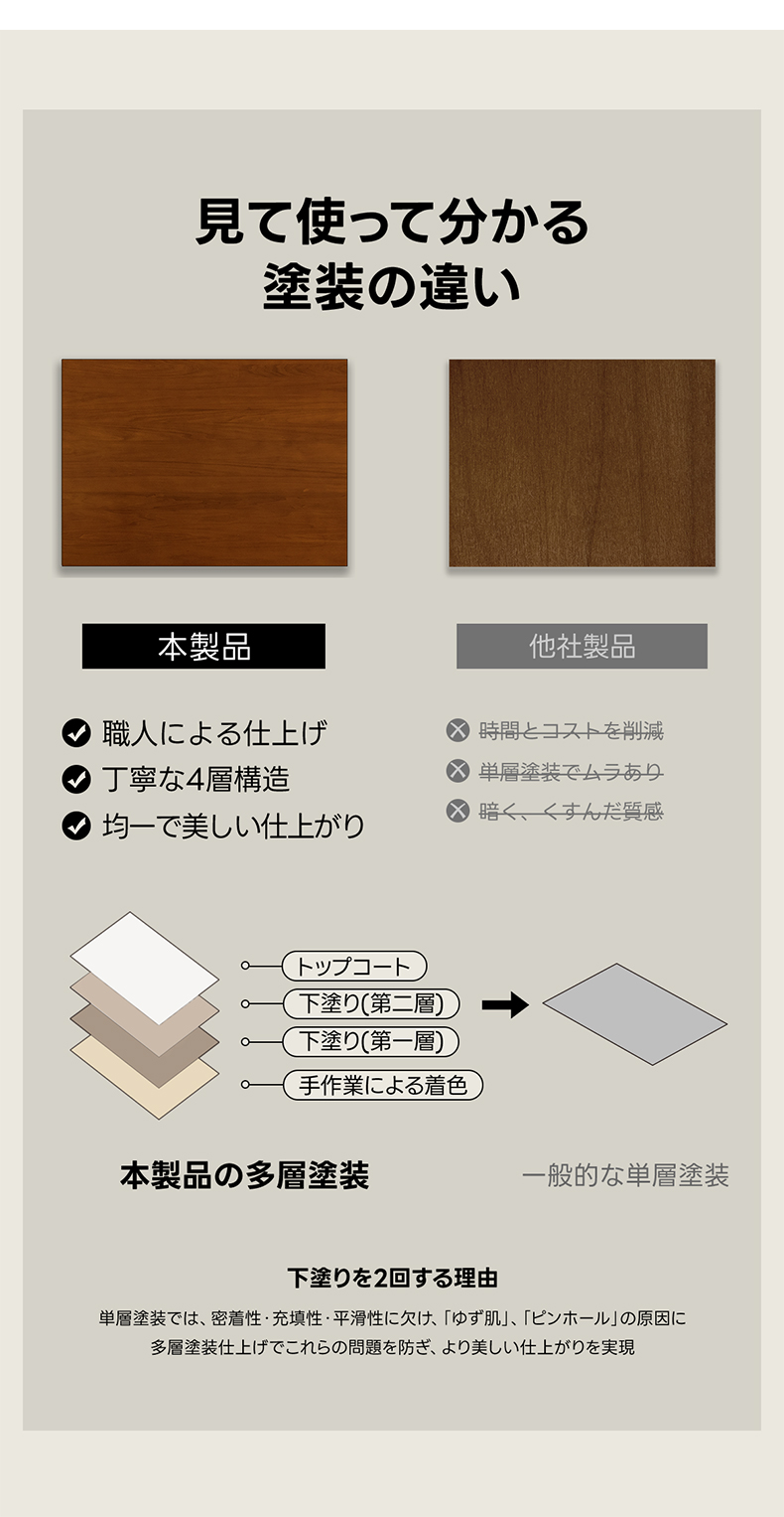 - 【高品質な素材とデザイン】主材には高品質なツゲ材を使用し、耐久性と美しさを兼ね備えています。ENF級積層合板とMFD板が補助材として使用され、強度と安定性を確保しています。