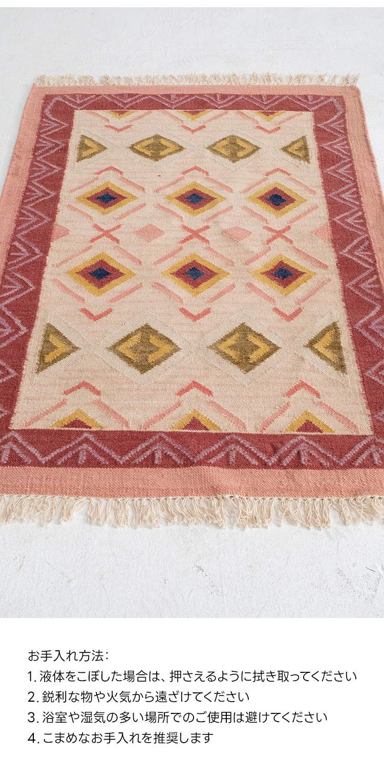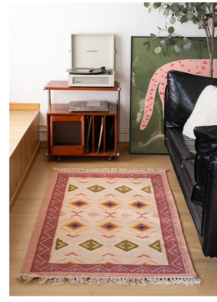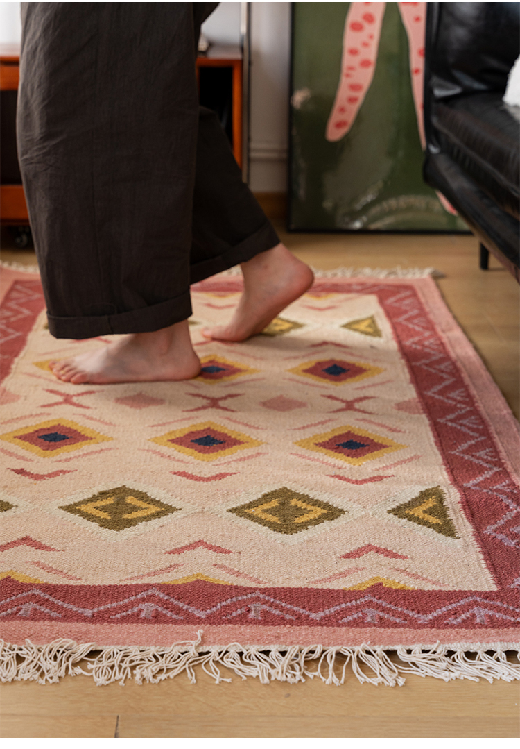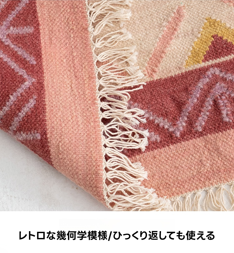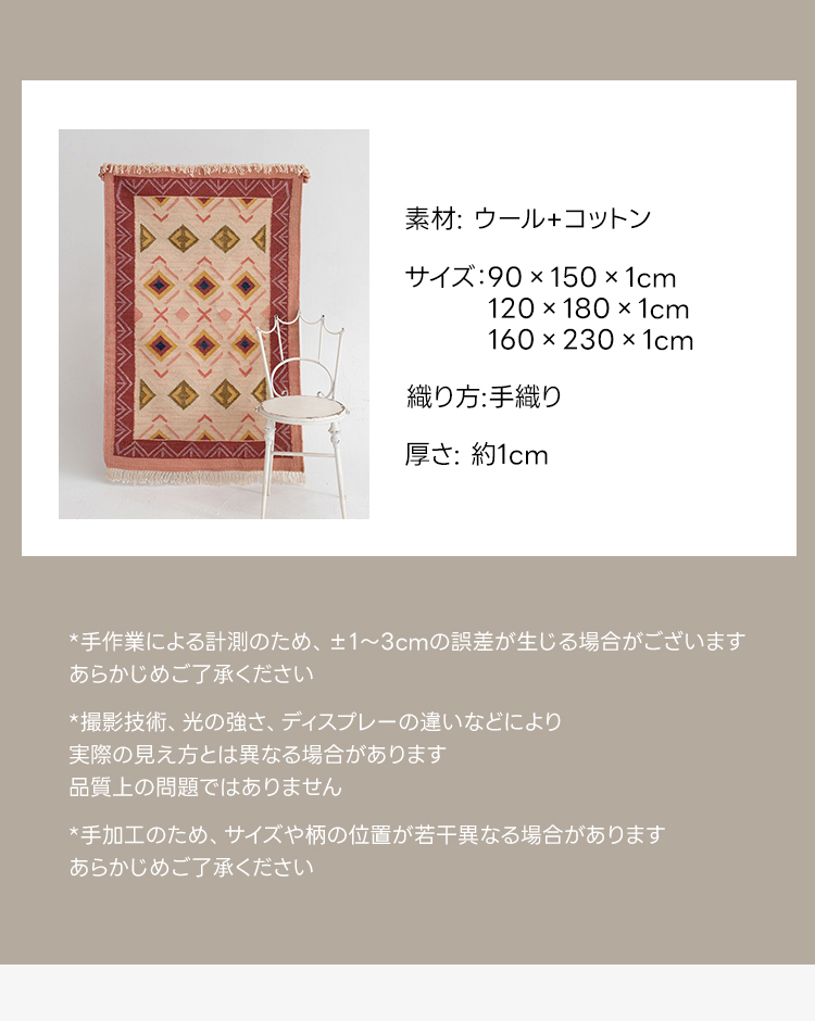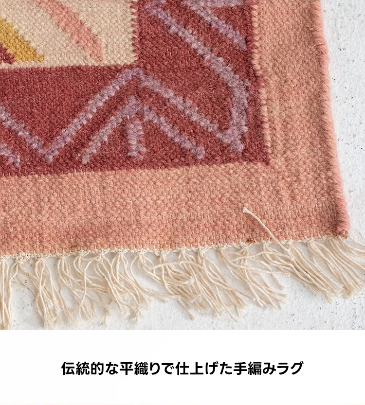 - 【エキゾチックデザインラグの核心機能】このラグは、伝統的な平織り技法で手編みされ、ウールとコットンを素材に使用しています。柔らかく快適な触り心地を提供し、インテリアにエキゾチックな雰囲気を演出します。