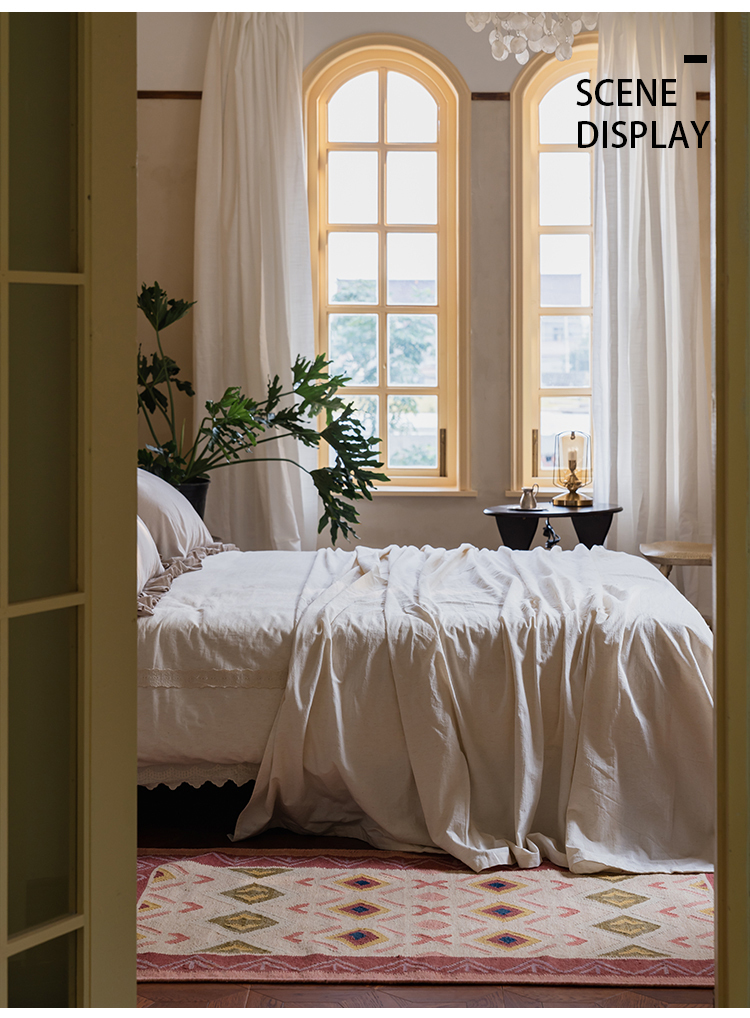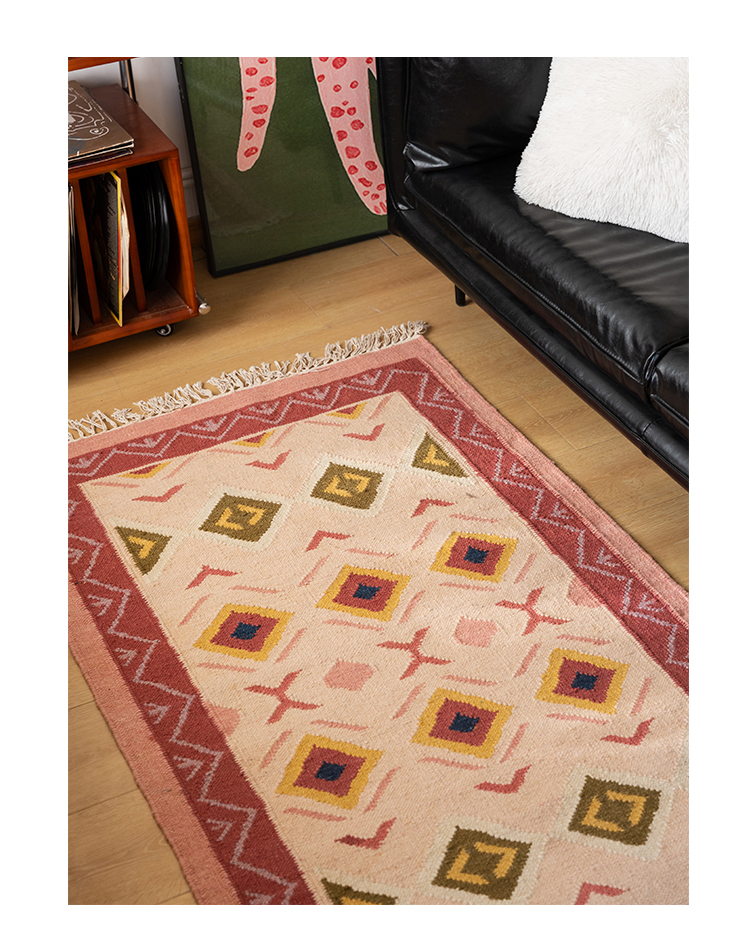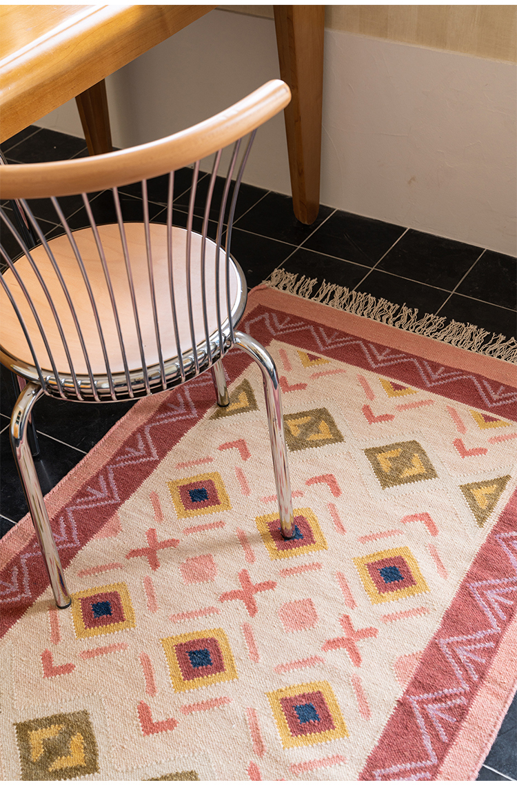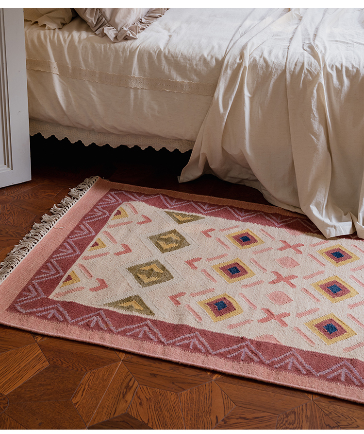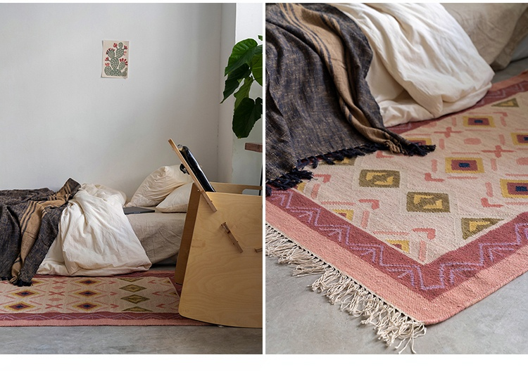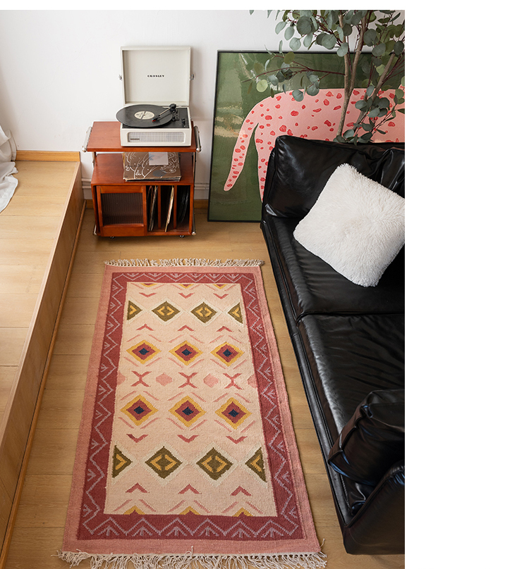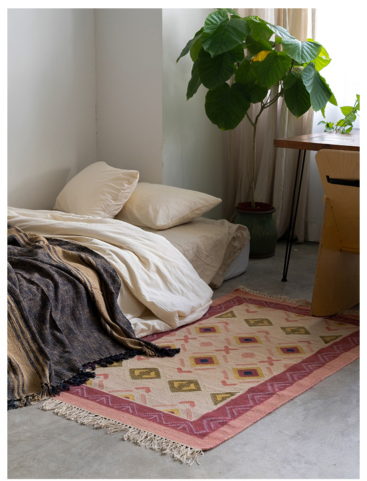 - 【エキゾチックデザインラグの核心機能】このラグは、伝統的な平織り技法で手編みされ、ウールとコットンを素材に使用しています。柔らかく快適な触り心地を提供し、インテリアにエキゾチックな雰囲気を演出します。