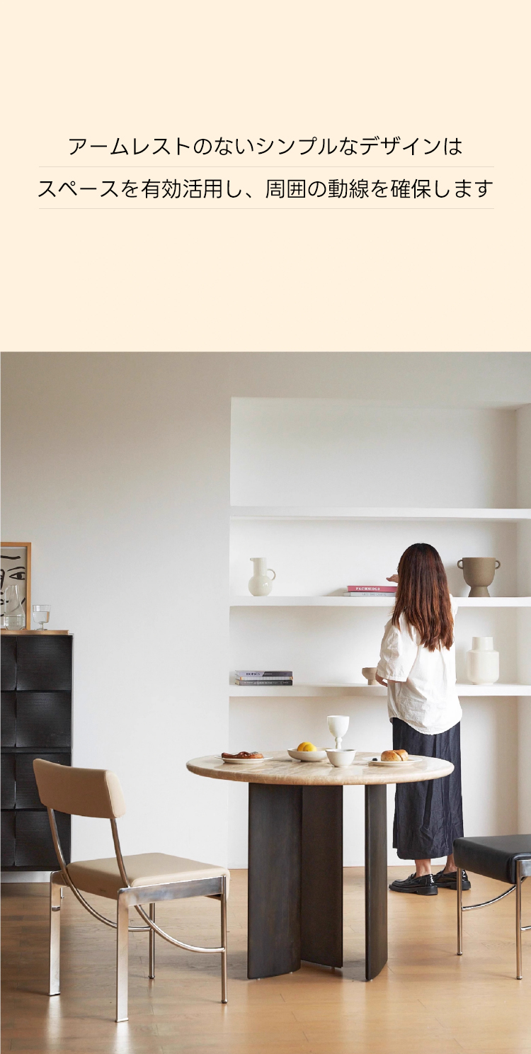 - 【多様な使用シーン】:このチェアはダイニングチェアとしてだけでなく、書斎やホームオフィス、寝室などさまざまな空間にマッチします。カップルやファミリー、一人暮らしの方にも最適で、どんなインテリアスタイルにも自然に溶け込みます。