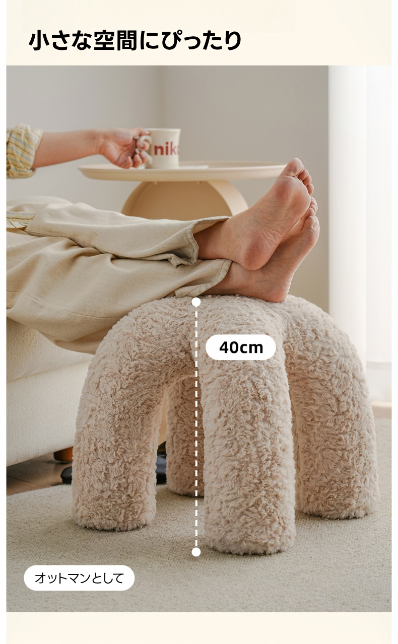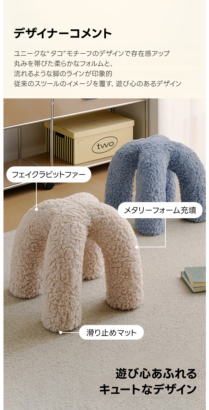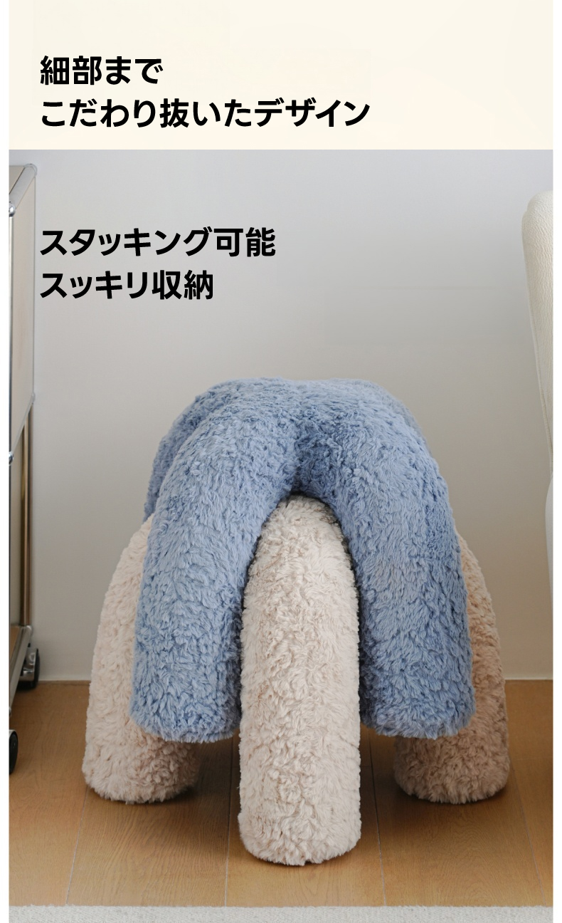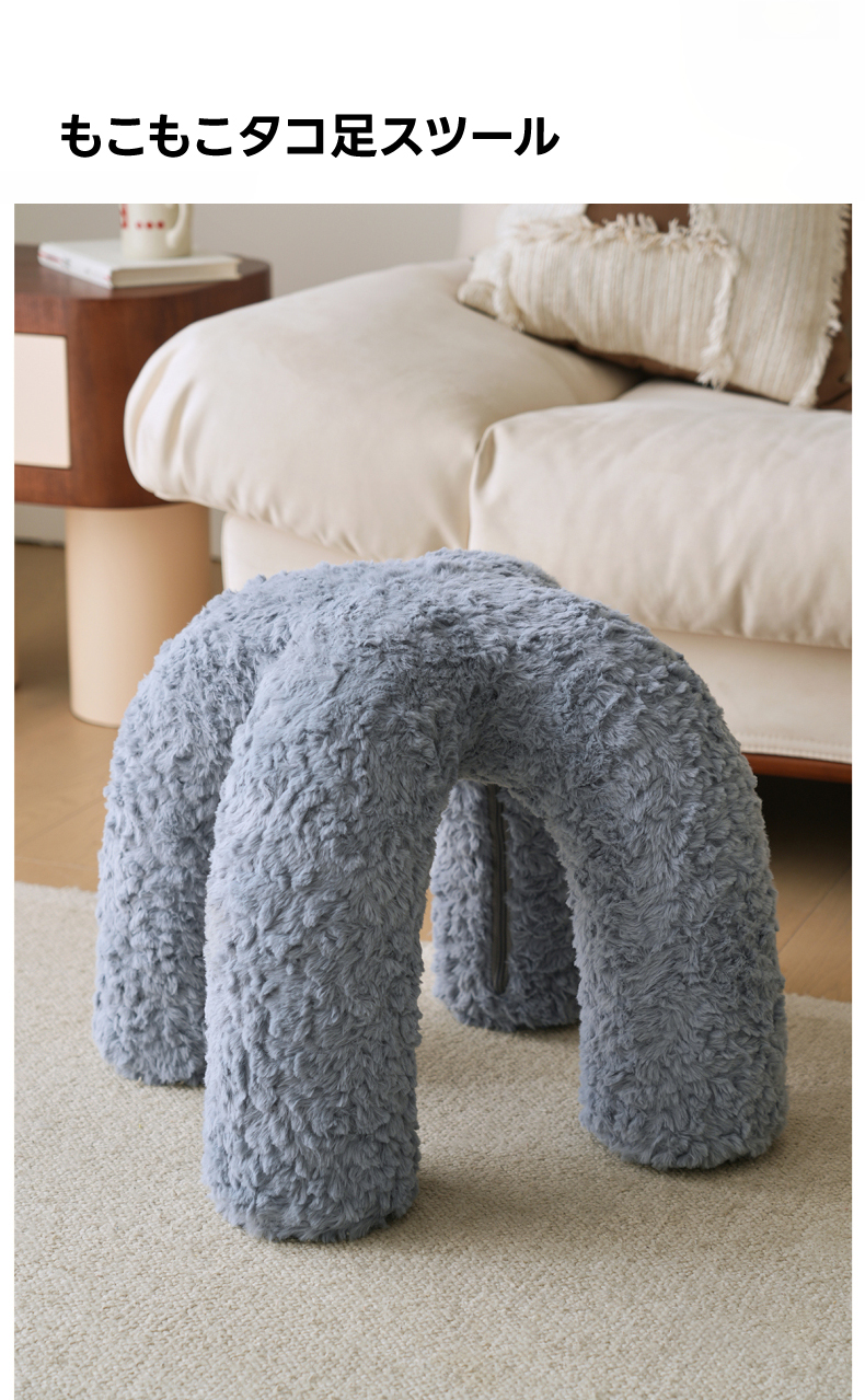 - 【ユニークなデザインと多機能性】もこもこタコ足スツールは、ユニークなタコ足デザインでお部屋に個性をプラスします。座椅子やローチェアとしてはもちろん、玄関スツールやソファスツールとしてもご使用いただけます。スタッキング可能で収納も簡単です。