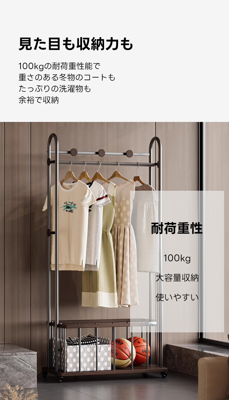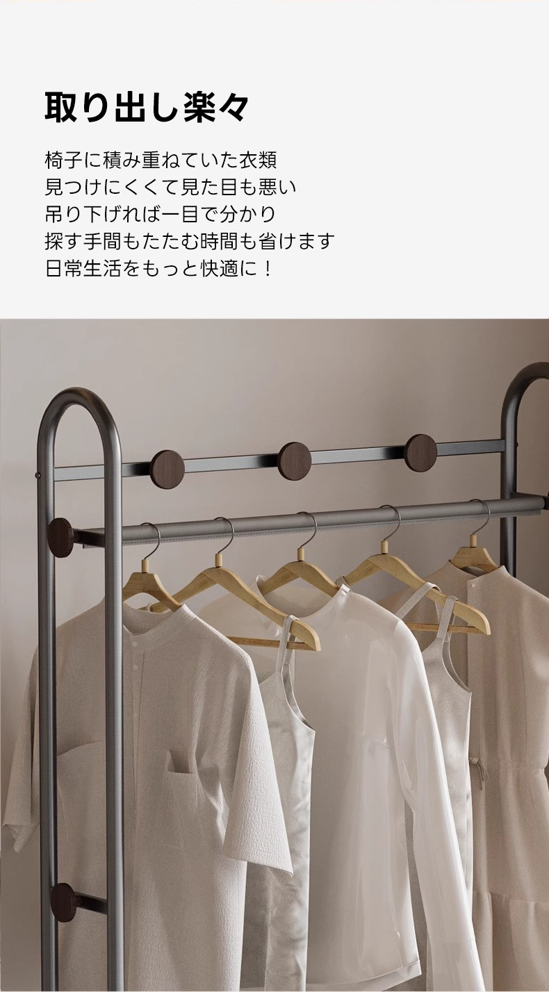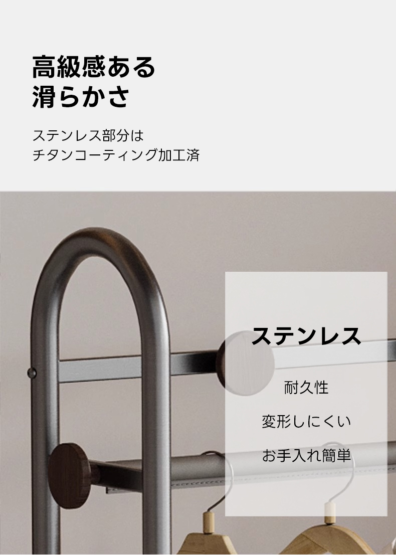 - 【高級感あるデザインと優れた耐荷重】ステンレス製のフレームにチタンコーティングを施し、耐久性と滑らかさを両立。最大100kgの耐荷重性能を持ち、重い冬物のコートや大量の洗濯物も安心して収納できます。