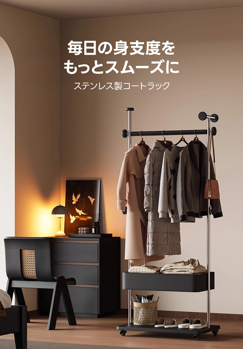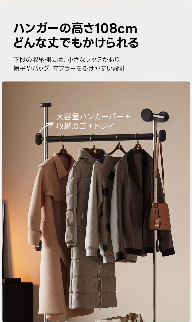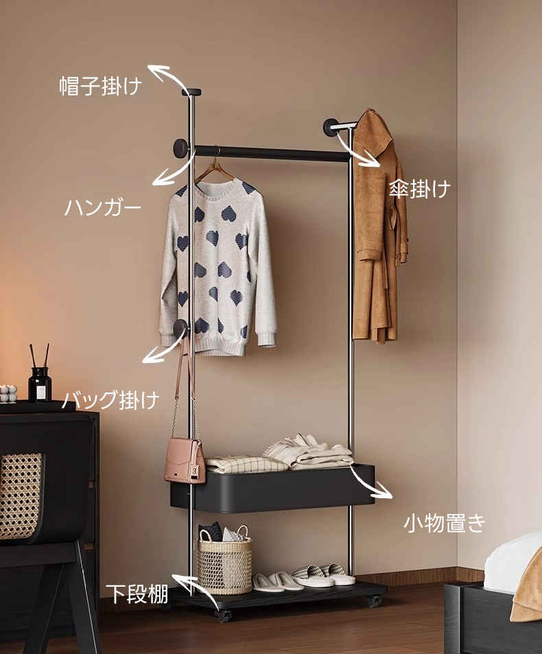 - 【多機能設計で収納力抜群】オールインワンハンガーラックは、60cmのハンガーバーを備え、コートやジャケットをしっかりと掛けられます。さらに、帽子掛けやバッグ、傘を掛けるフックも付いており、収納力が抜群です。下部には収納カゴとトレイがあり、靴や小物を整理整頓できます。