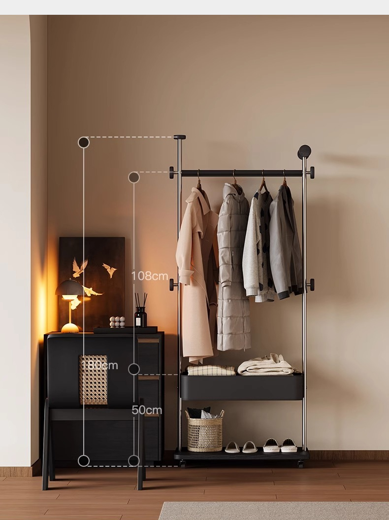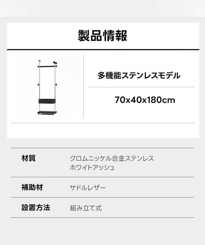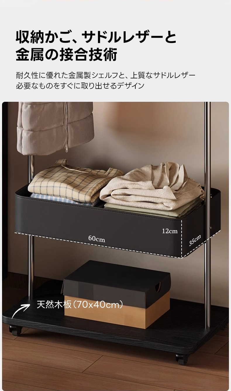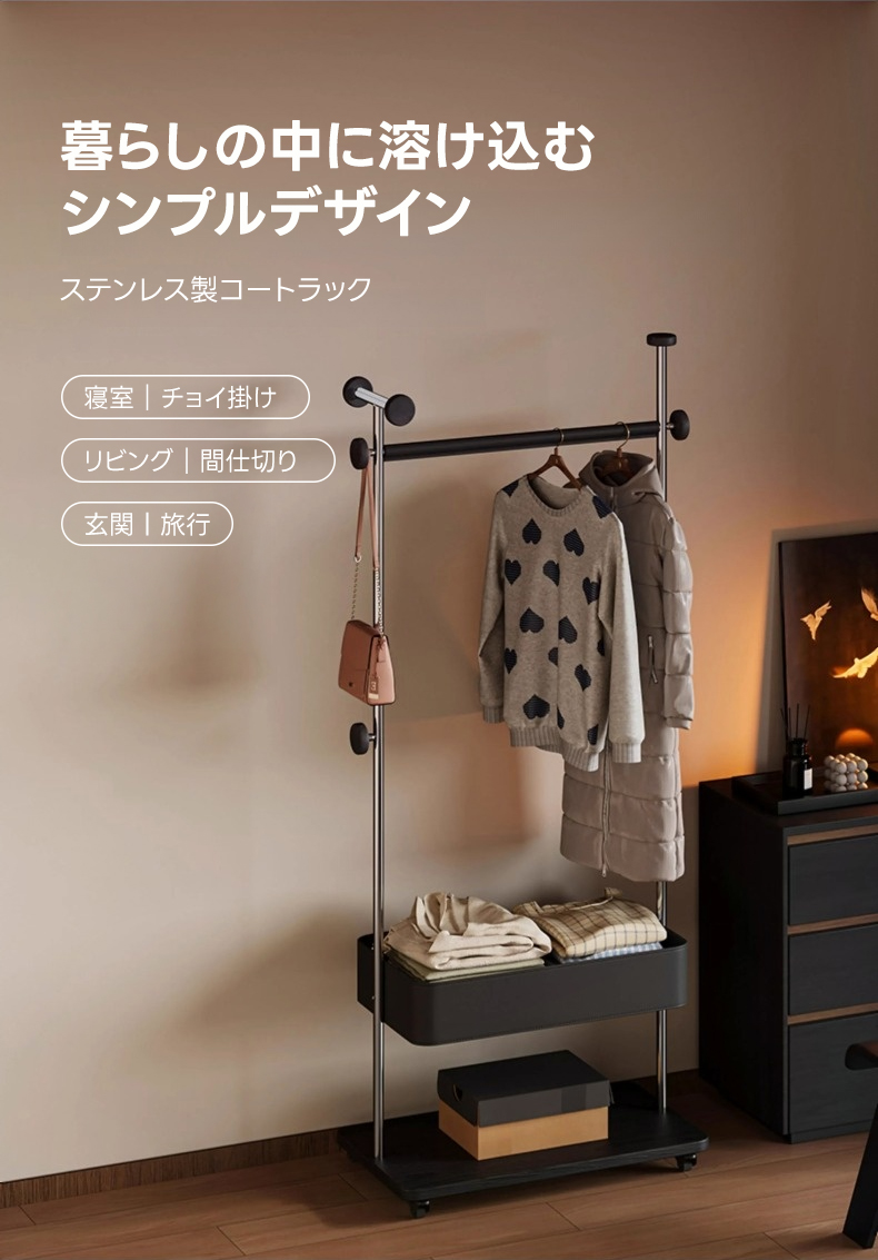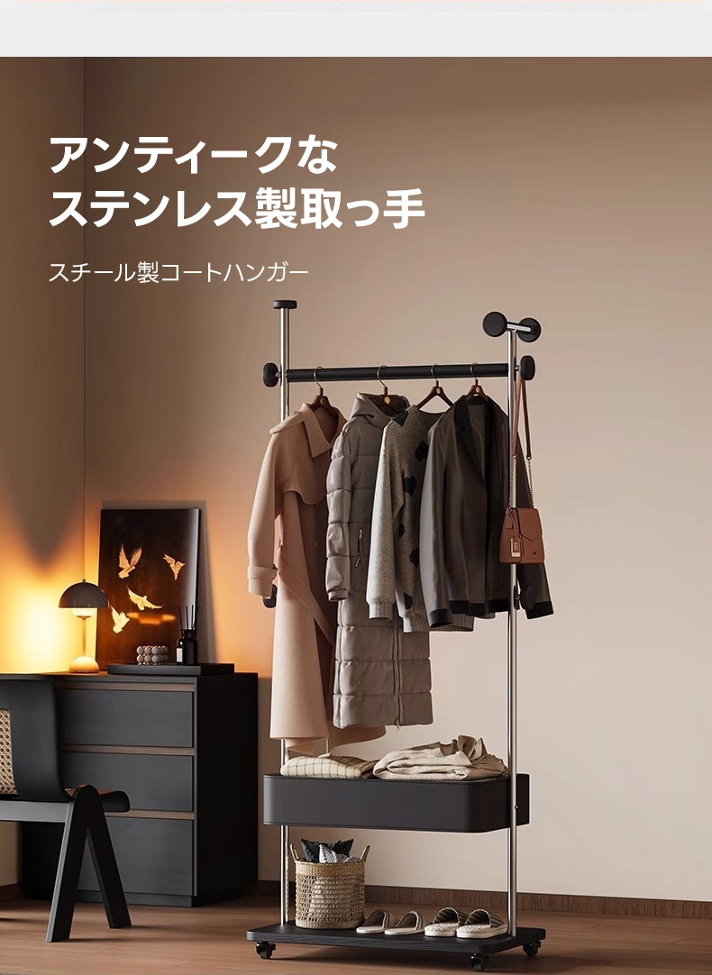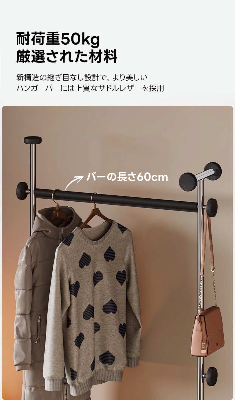 - 【様々なシーンで活躍】このハンガーラックは、リビングや寝室、玄関など様々な場所で活用できます。カップルやファミリー、一人暮らしの方々に最適で、シンプルでありながらラグジュアリーな雰囲気を演出します。