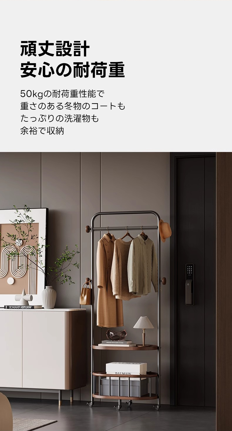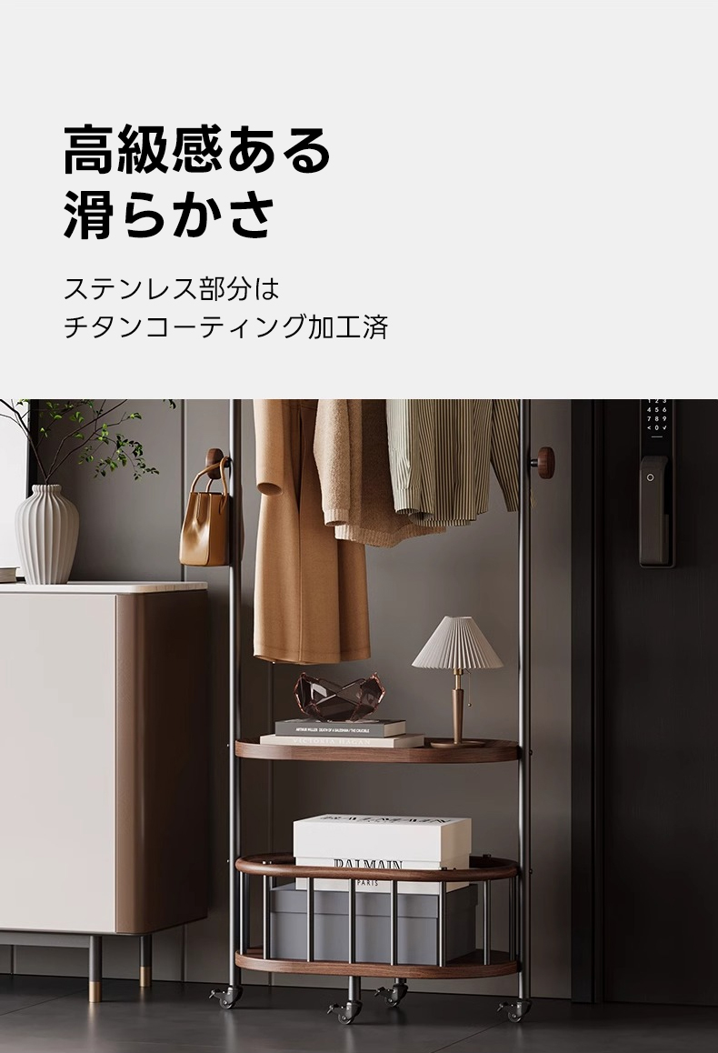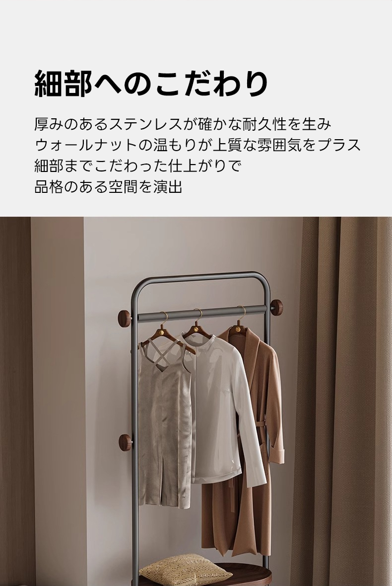 - 【高品質素材と耐久性】ステンレス、ウォールナット、ラバーウッド、レザーを使用し、耐久性と高級感を実現。ステンレス部分にはチタンコーティングが施され、滑らかな質感を提供します。最大50kgの耐荷重性能を持ち、重いコートや洗濯物も安心して収納可能です。