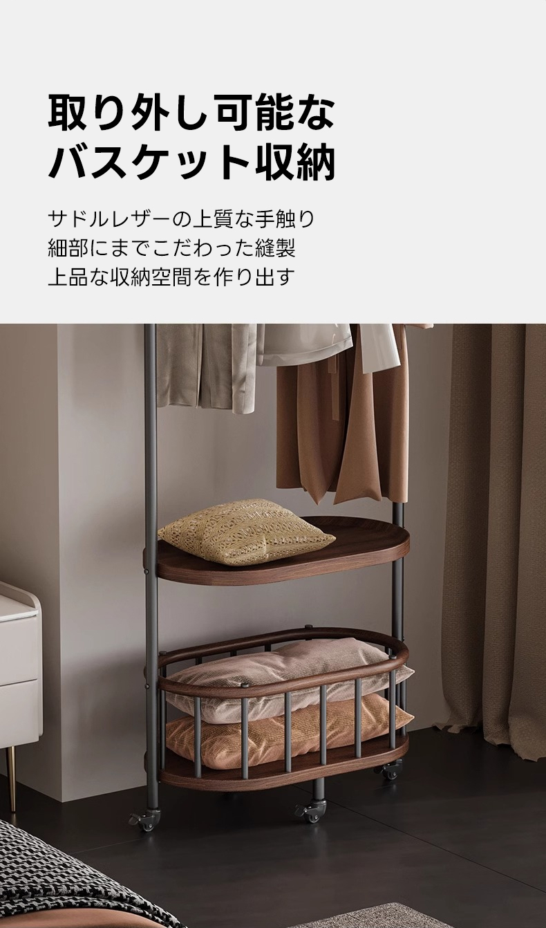 - 【多機能でスタイリッシュなデザイン】モダンシェルフ付きハンガースタンドは、コートや衣類をスタイリッシュに収納できるだけでなく、取り外し可能なバスケット収納も備えています。リビング、寝室、玄関など、どんなインテリアにもマッチし、空間を有効活用できます。