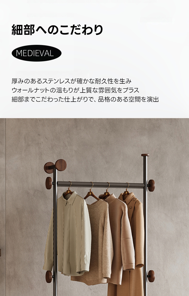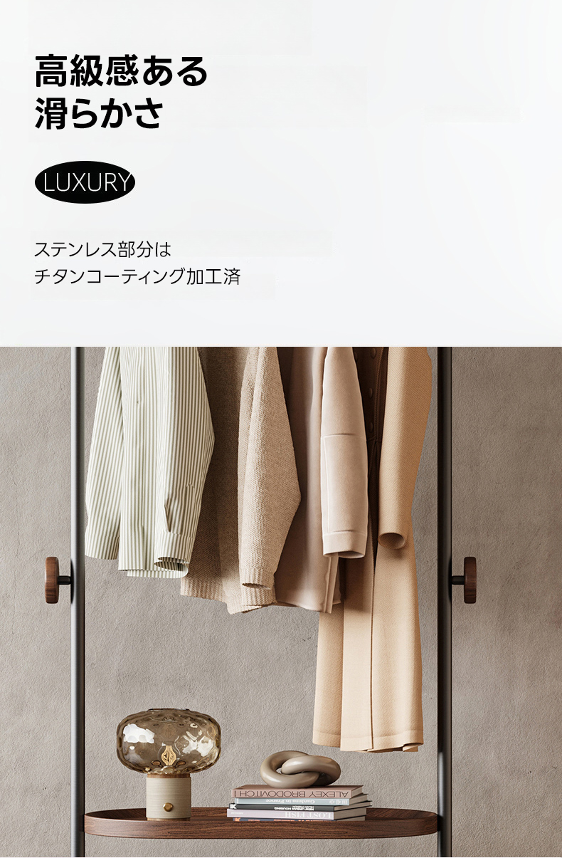 - 【高品質な素材とデザイン】耐久性のあるステンレス製フレームにチタンコーティングを施し、ウォールナットのフックとラバーウッドの底板が上質な雰囲気を演出します。50kgの耐荷重で安心して使用できます。