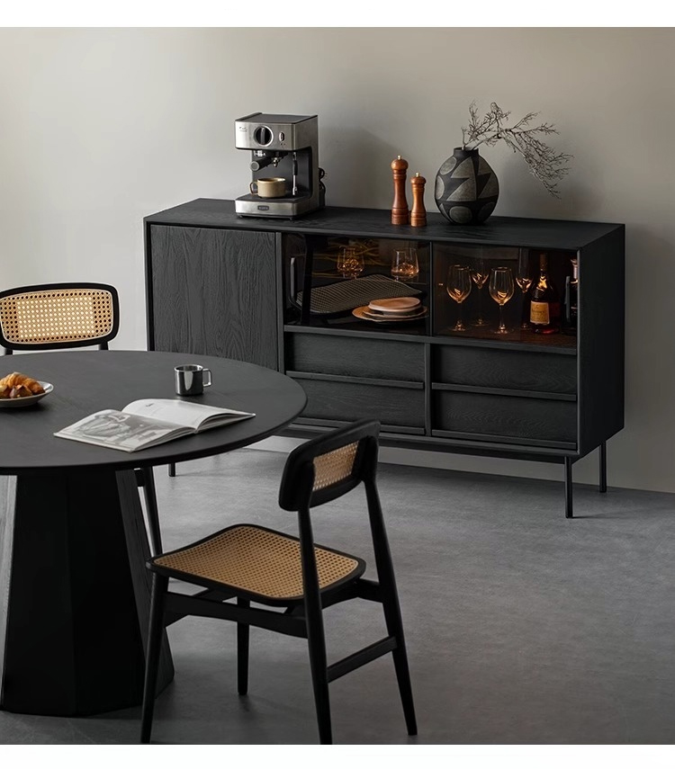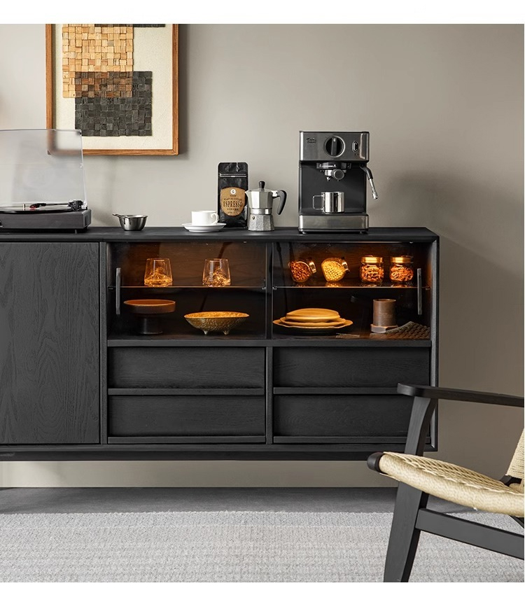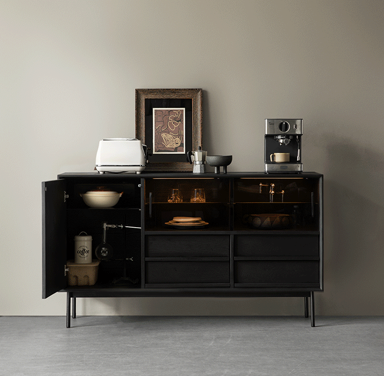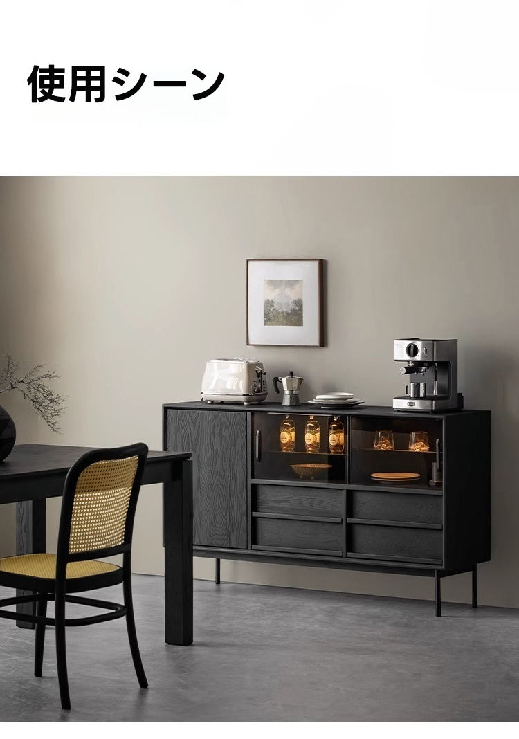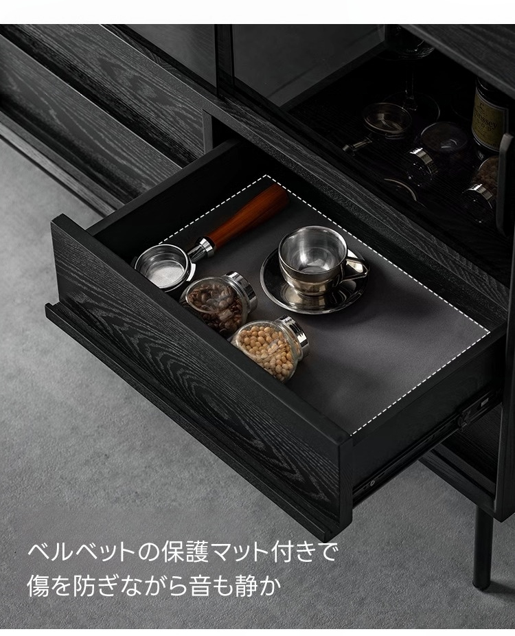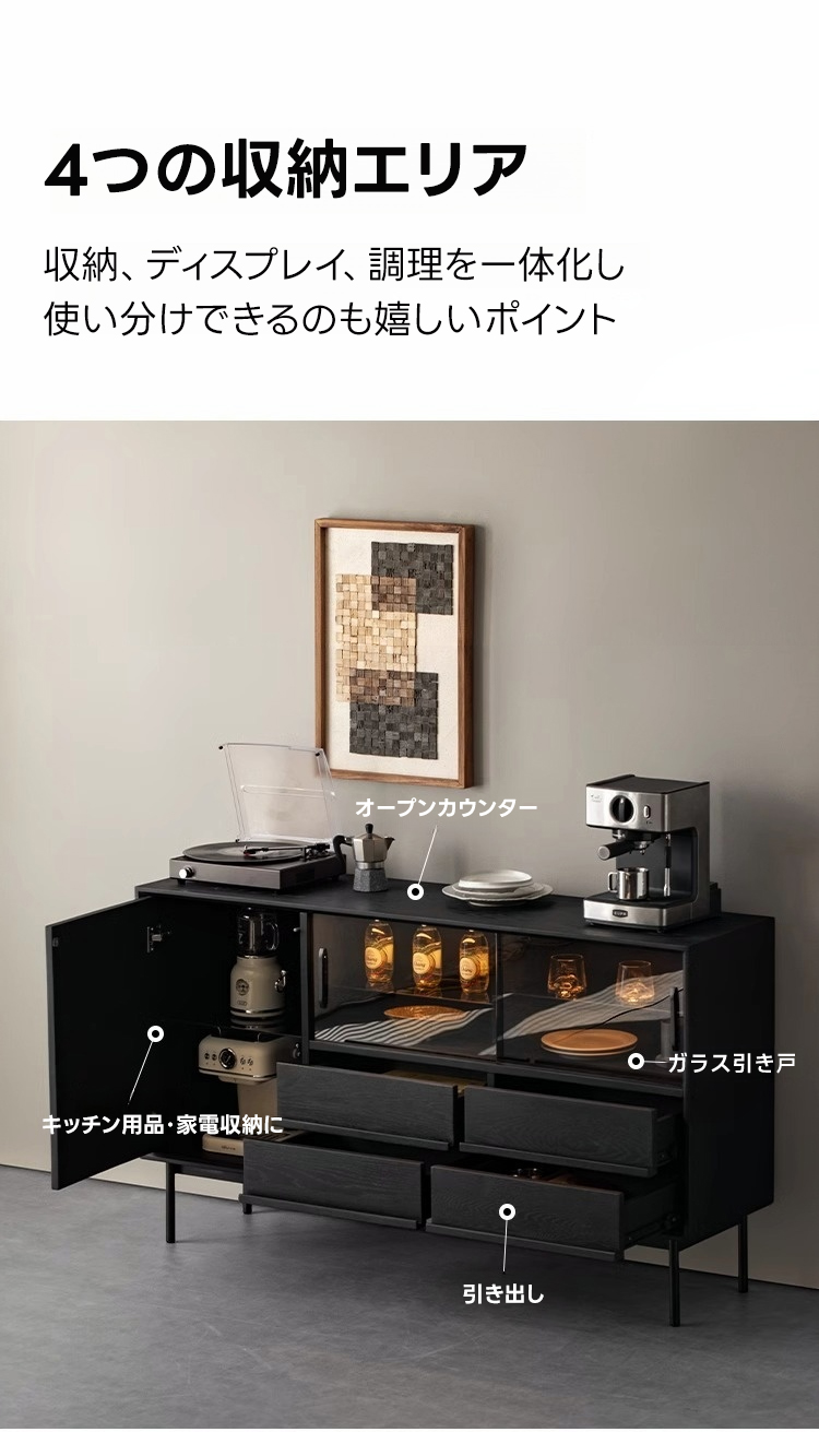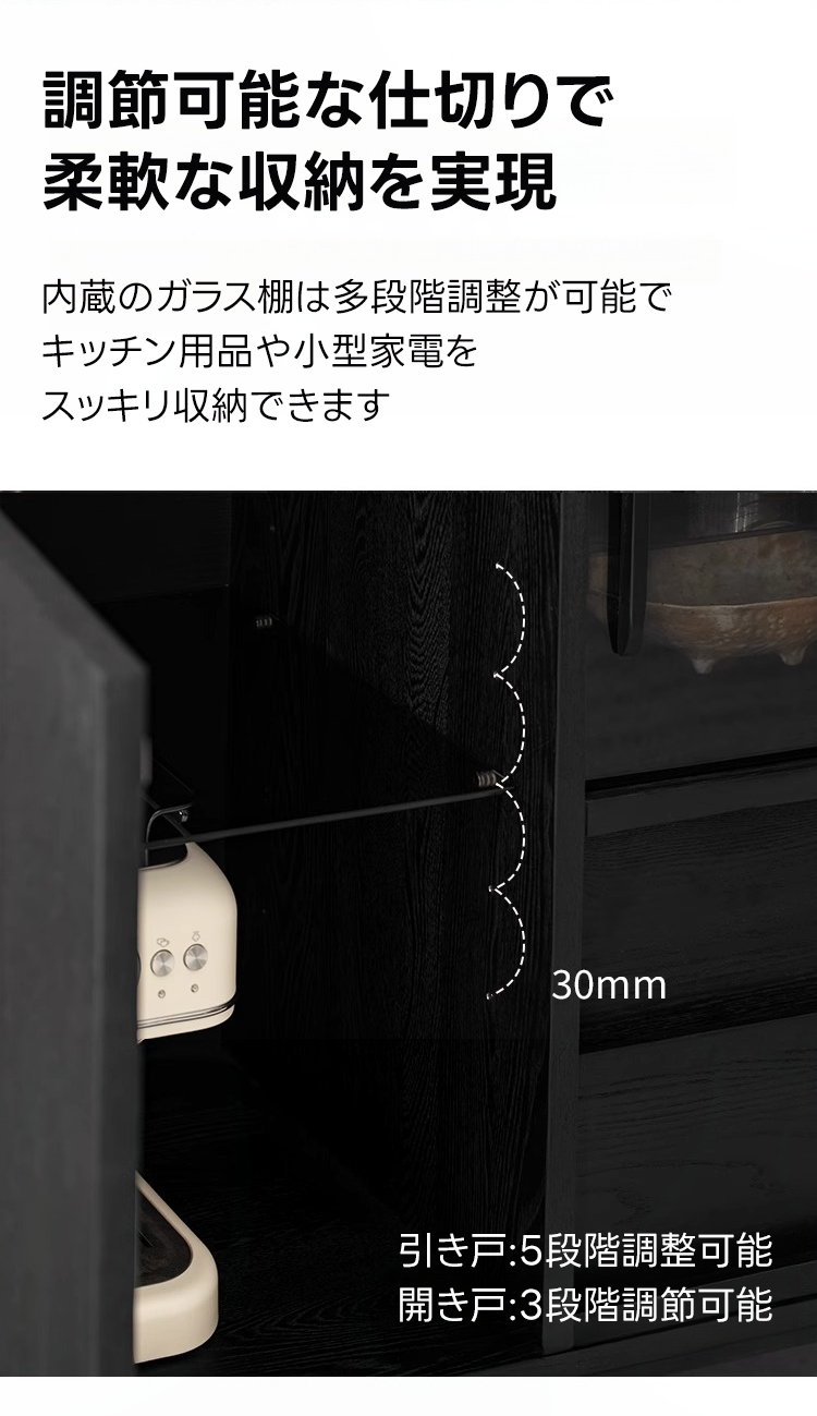 - 【多機能収納力】このブラックキッチンボードは、4つの収納エリアを備え、収納、ディスプレイ、調理を一体化。引き出しやガラス引き戸で整理整頓が簡単です。内部のガラス棚は多段階調整が可能で、キッチン用品や小型家電をすっきり収納できます。