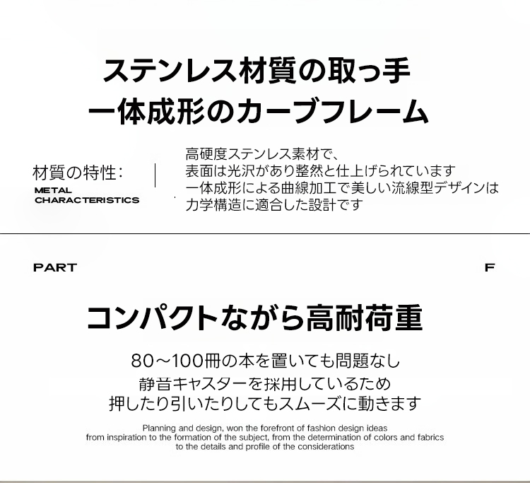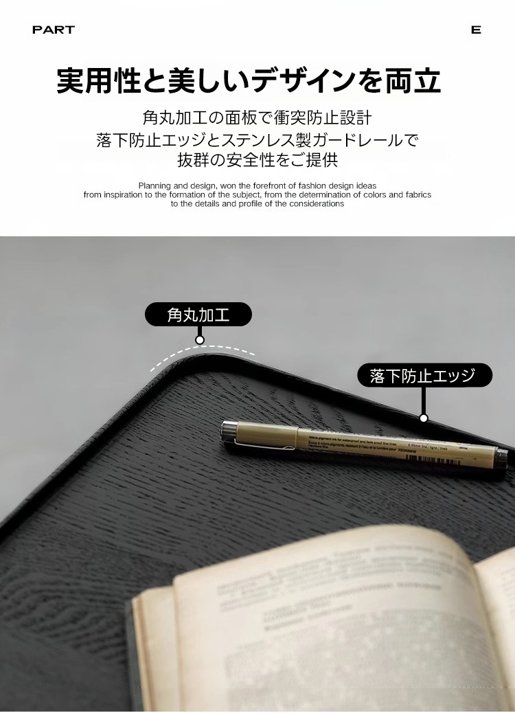 - 【安全性とユーザー価値】角丸加工と落下防止エッジにより、安全性を高めています。ステンレス製ガードレールが、収納物の落下を防ぎます。コンパクトながら80~100冊の本を収納できる高い耐荷重を誇ります。
