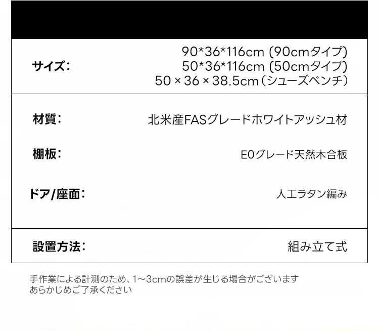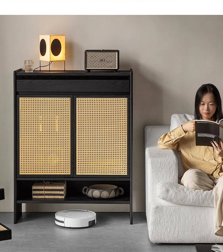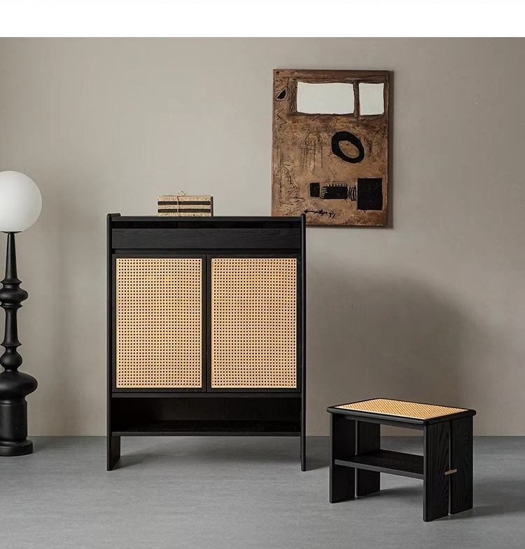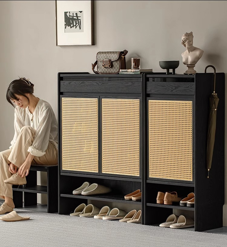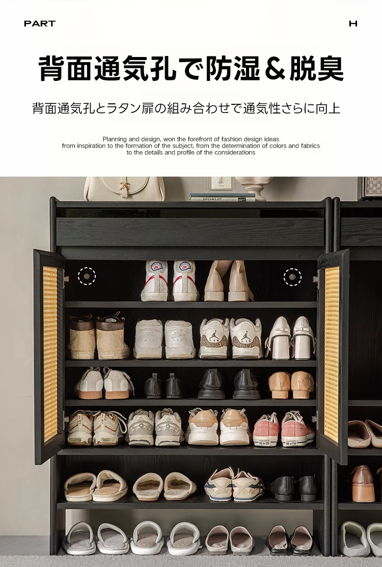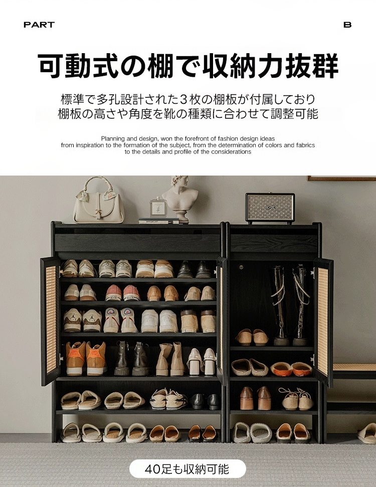 - 【高級素材使用で耐久性抜群】:北米産FASグレードのホワイトアッシュ材を使用したこのシューズラックは、長期間にわたって使用可能な耐久性を誇ります。ラタンの扉は通気性が良く、靴の湿気や臭いを防ぎます。
