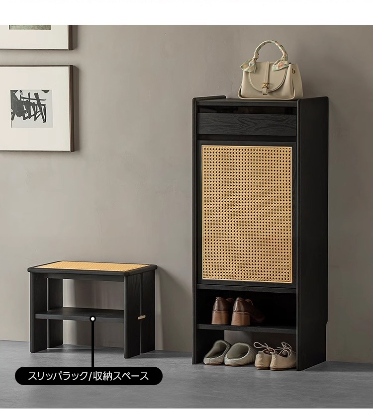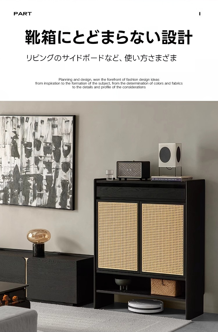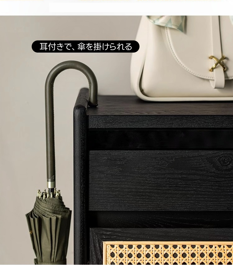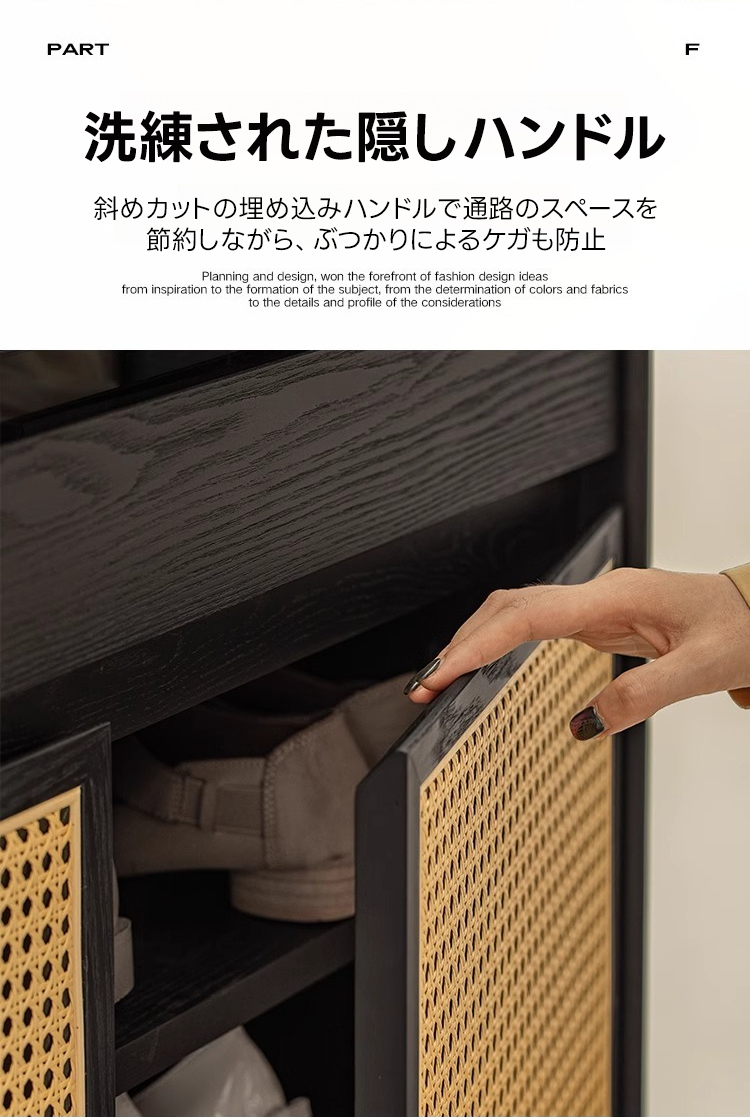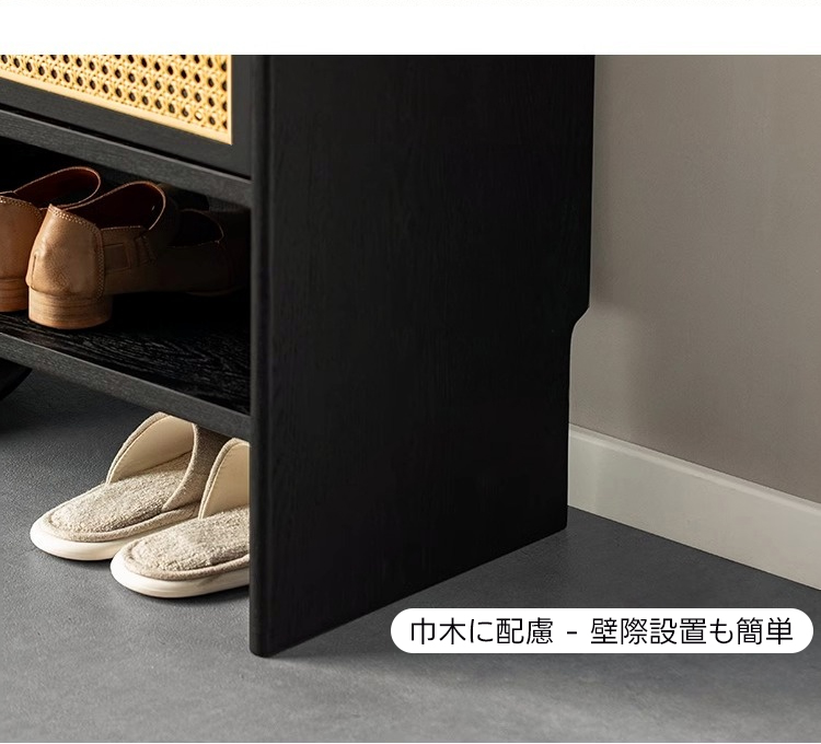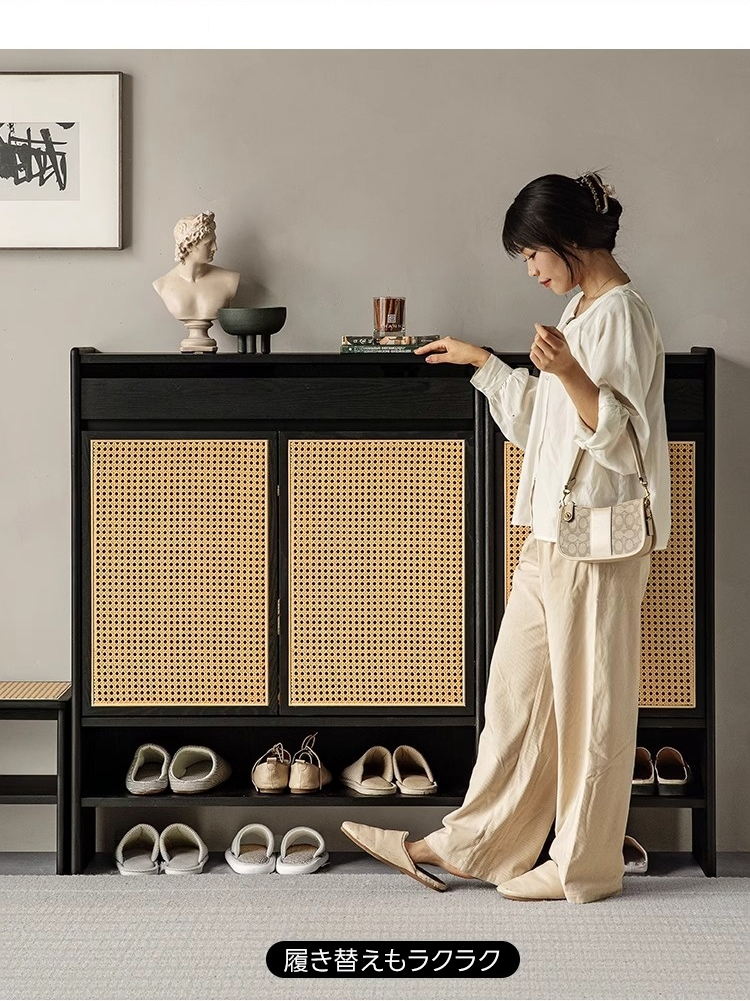 - 【シンプルモダンなデザイン】:ブラックのフレームにラタンの扉がアクセントとなり、どんなインテリアにもマッチするシンプルモダンなデザインです。玄関をスタイリッシュに演出します。