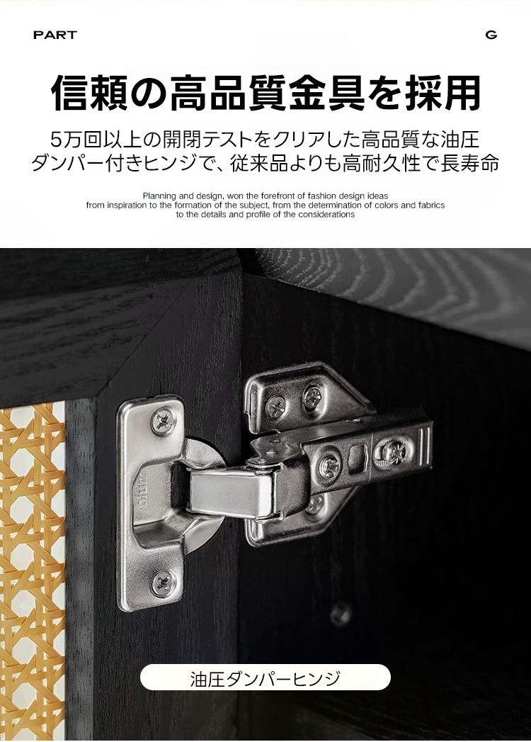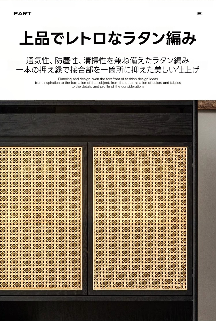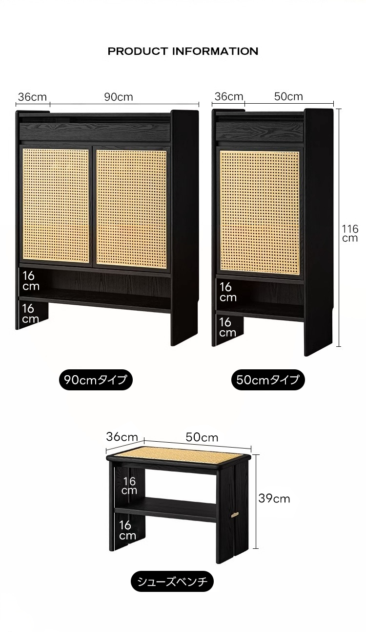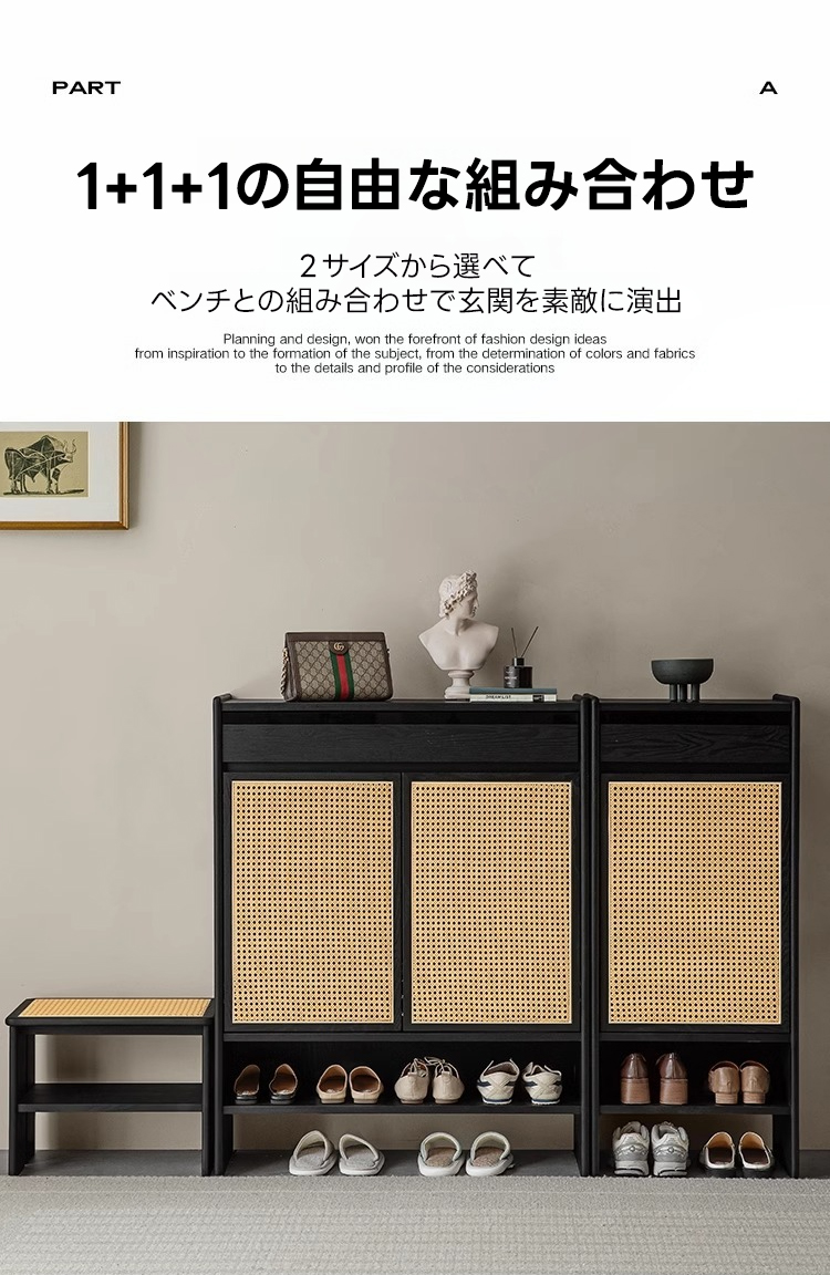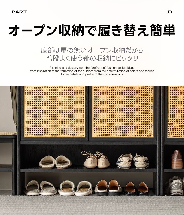 - 【シンプルモダンなデザイン】:ブラックのフレームにラタンの扉がアクセントとなり、どんなインテリアにもマッチするシンプルモダンなデザインです。玄関をスタイリッシュに演出します。