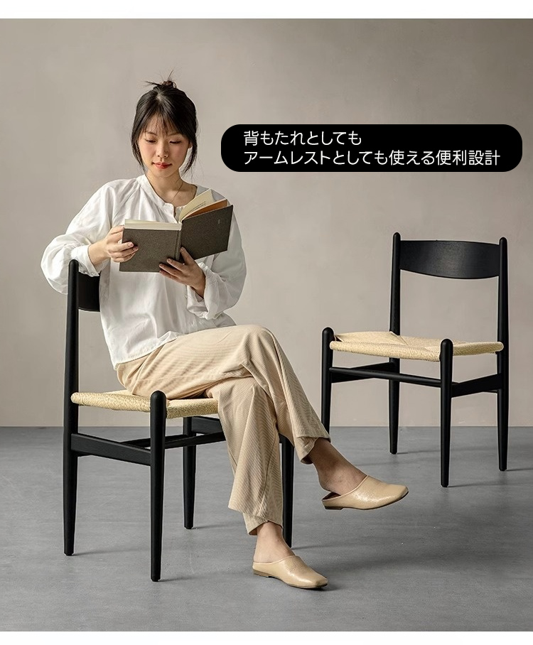 - 【高品質な素材とデザイン】:フレームにはホワイトアッシュ材を使用し、座面にはペーパーコードが用いられています。手作業による三つ編み技術で仕上げられ、軽量で通気性が良く、長時間座っても疲れにくい設計です。ほぞ組構造により、頑丈で安定した座り心地を提供します。