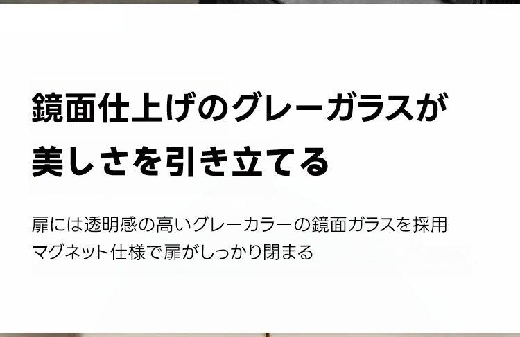 - 【シンプルモダンなデザイン】:どんなインテリアにもマッチするシンプルモダンなデザインで、ブラックのカラーが落ち着いた雰囲気を演出します。鏡面仕上げのグレーガラスがキャビネットの美しさを引き立てます。