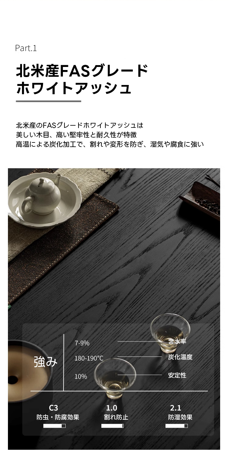 - 【優れた素材と品質】:低含水率のホワイトアッシュ材を使用し、長期間使用しても割れや反りを防ぎます。炭化加工により、湿気や腐食にも強い仕様です。