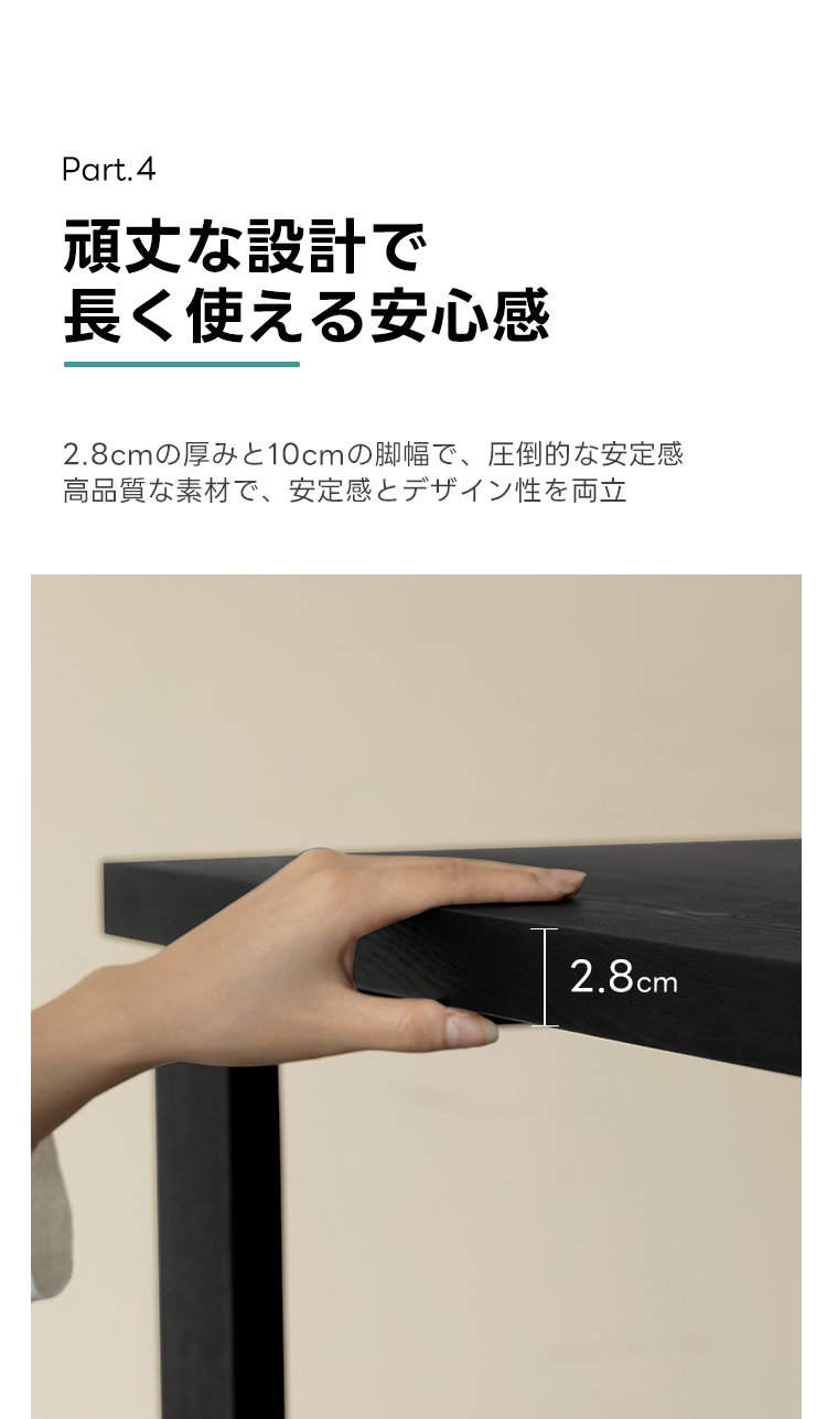 - 【快適な使用感と安定感】:2.8cmの厚みと10cmの脚幅で、圧倒的な安定感を実現。広々とした天板で、ゆったりとした使用感を楽しむことができます。