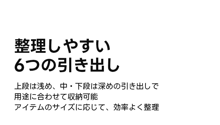 - 【高機能収納】6つの引き出しがあり、用途に応じた収納が可能です。上段は浅め、中・下段は深めの設計で、日常の様々なアイテムを整理整頓できます。