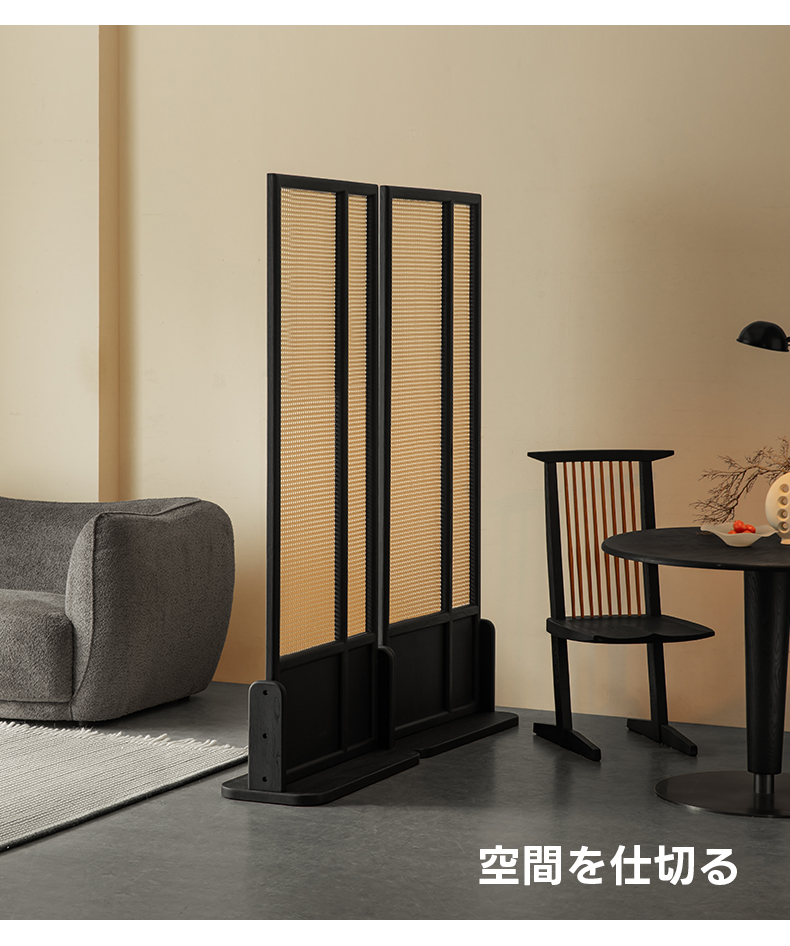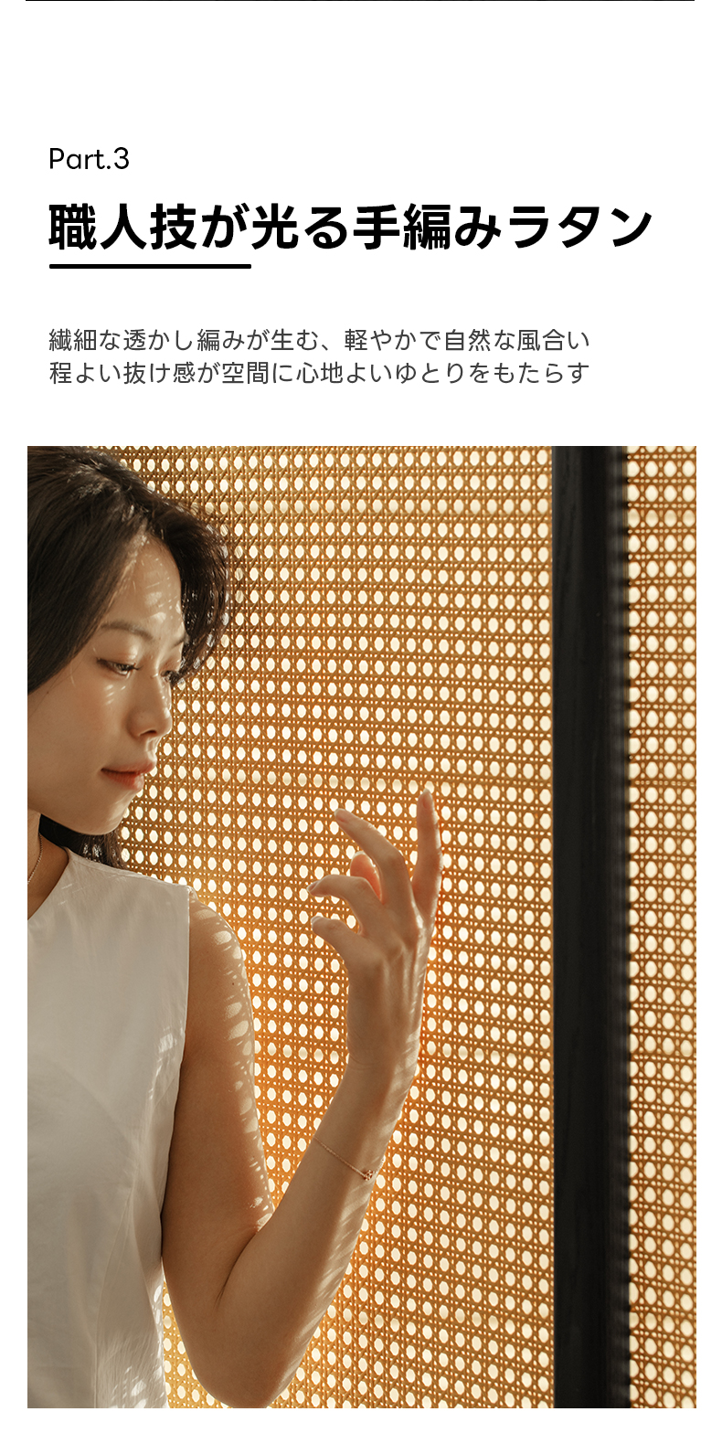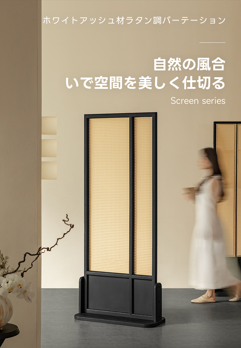 - 【高級感あふれるデザイン】ホワイトアッシュ材を使用したラタン調パーティションは、高級感と自然な風合いを兼ね備えています。手編みのラタン風編み目が空間に柔らかさと温かみを与えます。