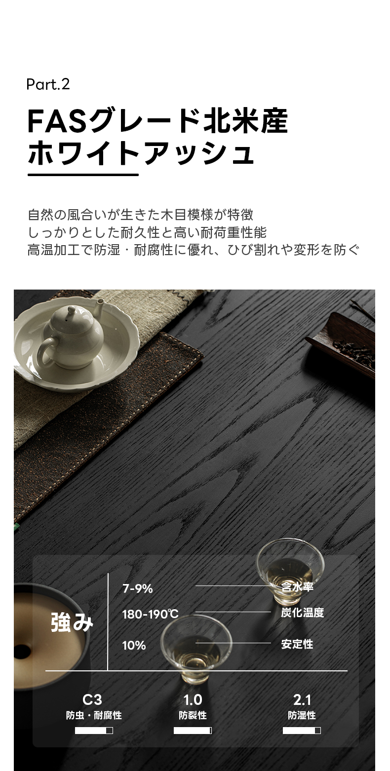 - 【高品質素材と耐久性】FASグレードのホワイトアッシュ材を使用し、防湿・耐腐性に優れ、ひび割れや変形を防ぐ加工が施されています。長期間にわたり美しさを保ちます。