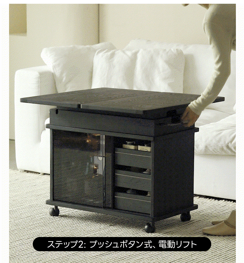 - 【リフトアップ機能で快適作業】:ガス圧式昇降機能を搭載し、65.5cmから90.5cmまで高さを自由に調整可能。作業や食事に最適な高さに設定でき、快適な使用感を提供します。