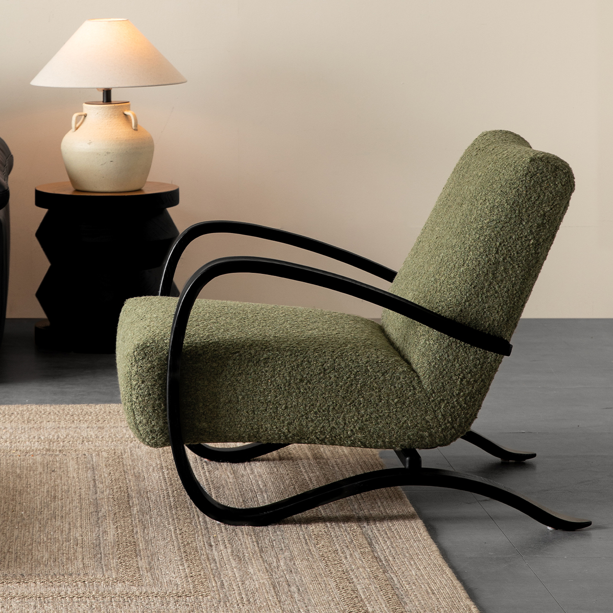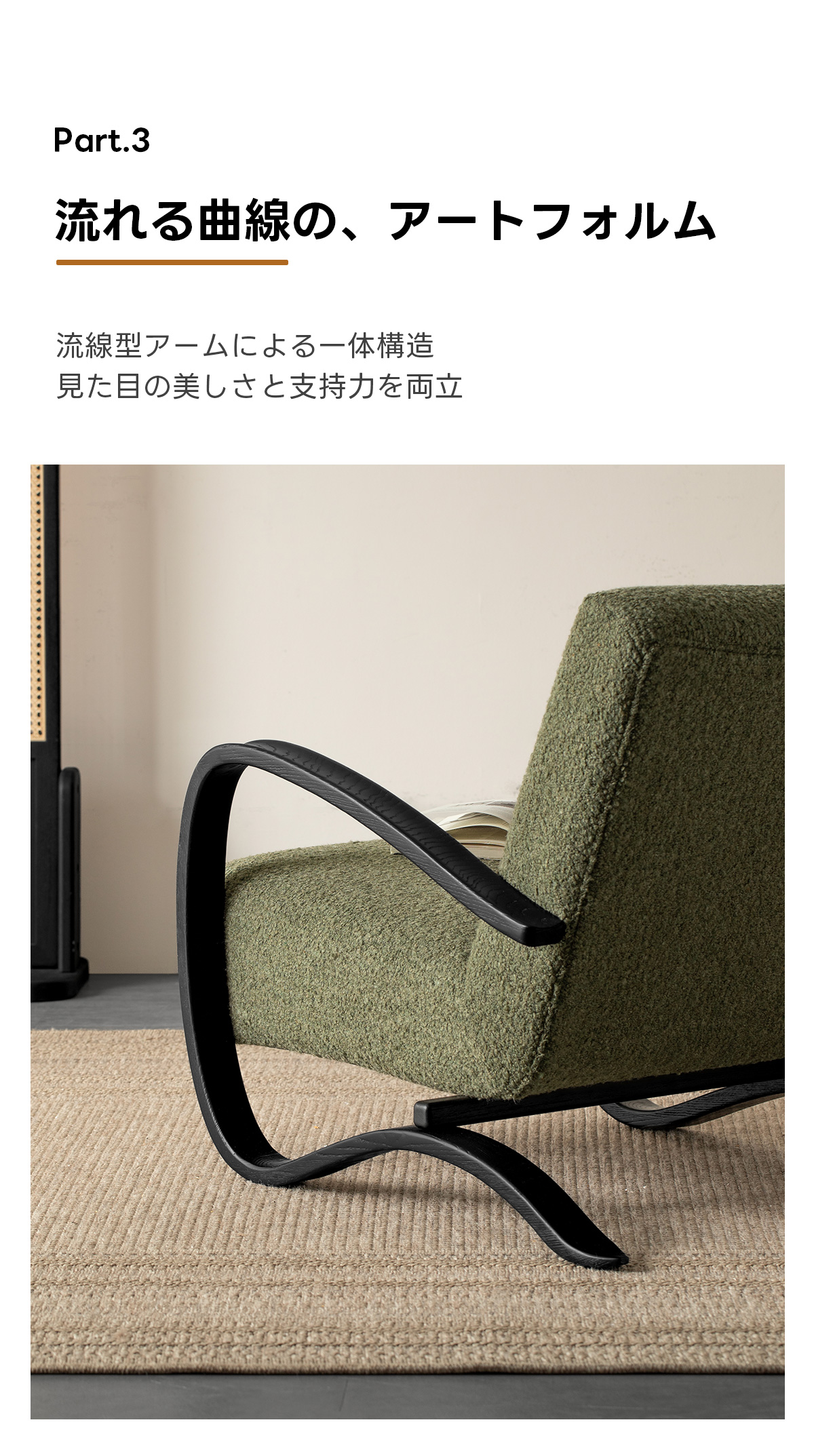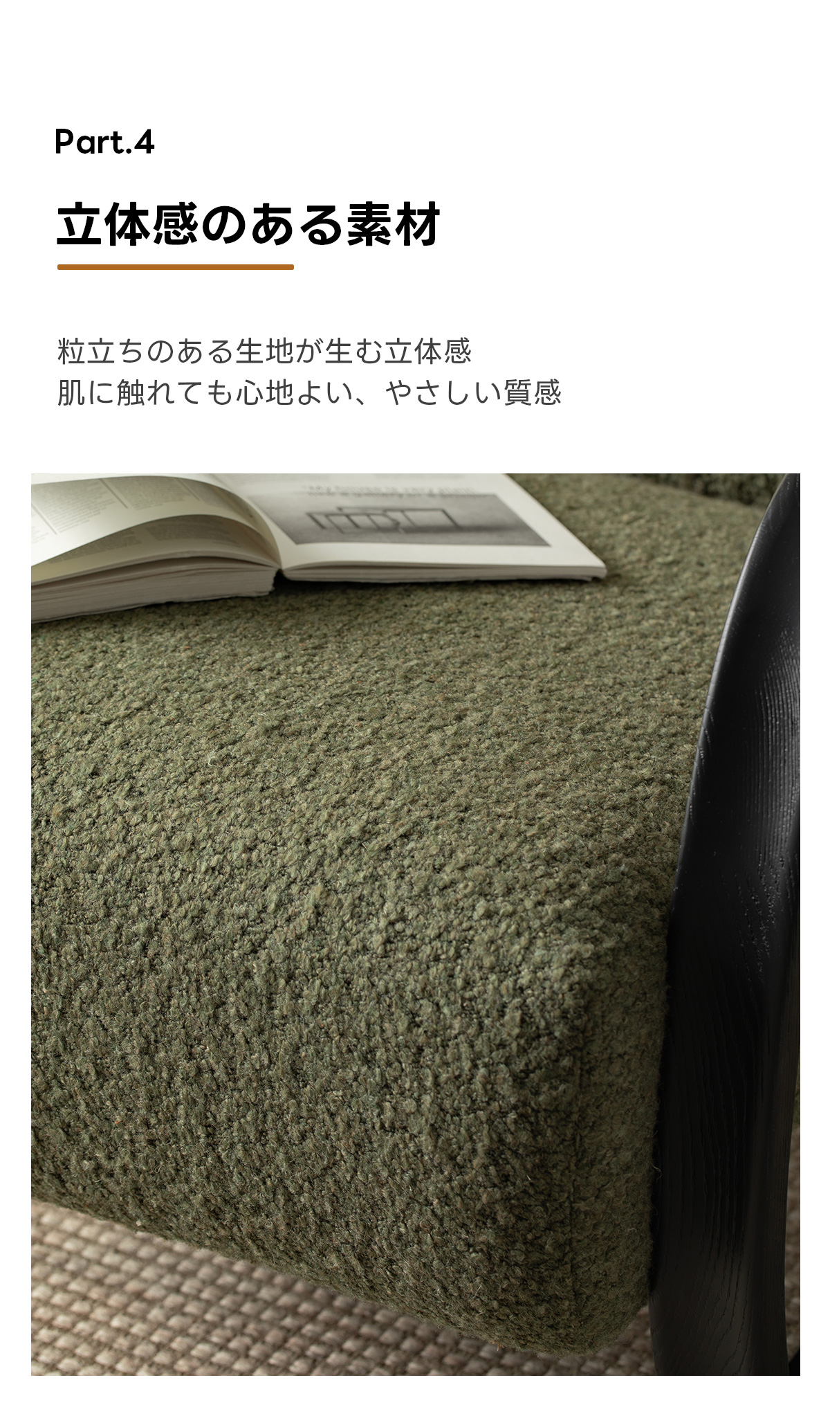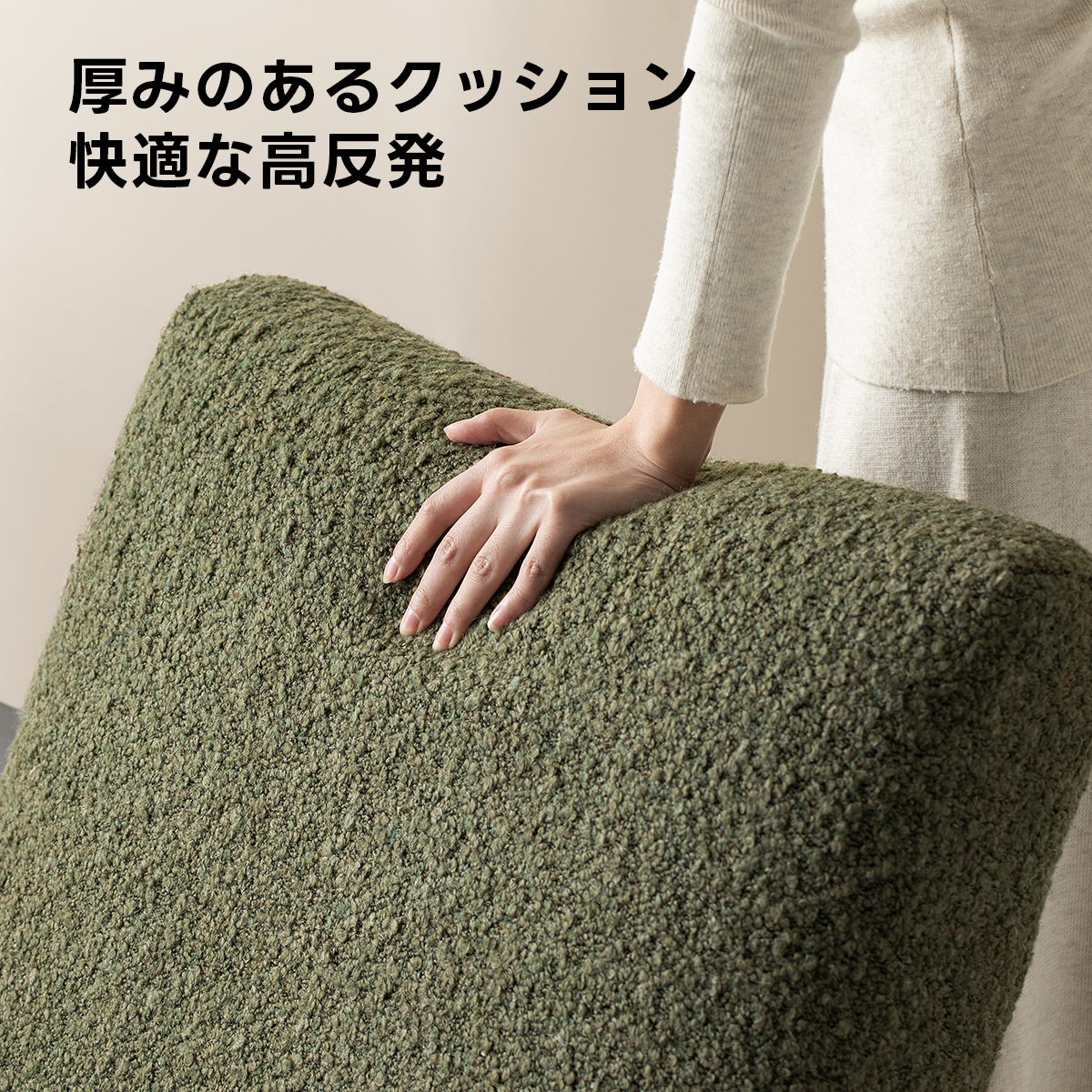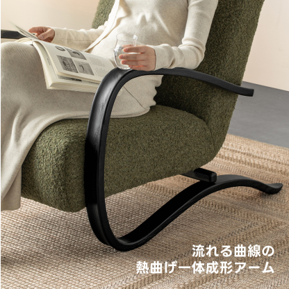 - 【高品質な素材とデザイン】:耐久性のあるブークレ生地は立体感があり、肌触りも優しいです。天然木フレームが全体の荷重をしっかりと受け止め、安心感のある座り心地を支えます。