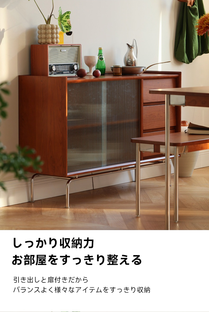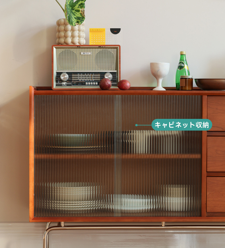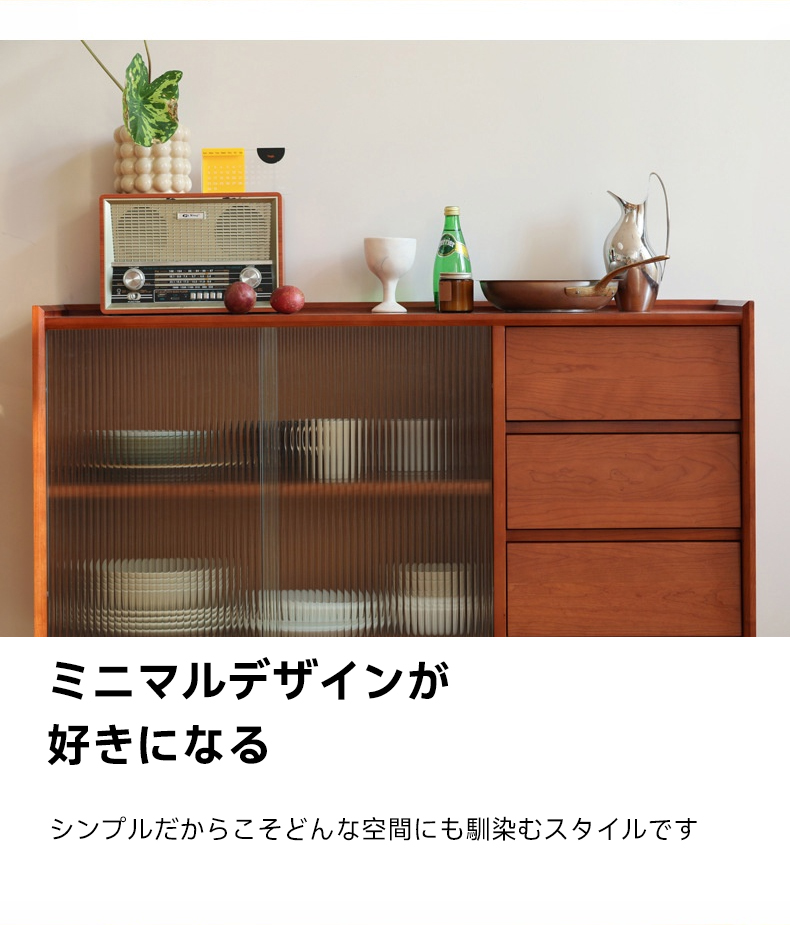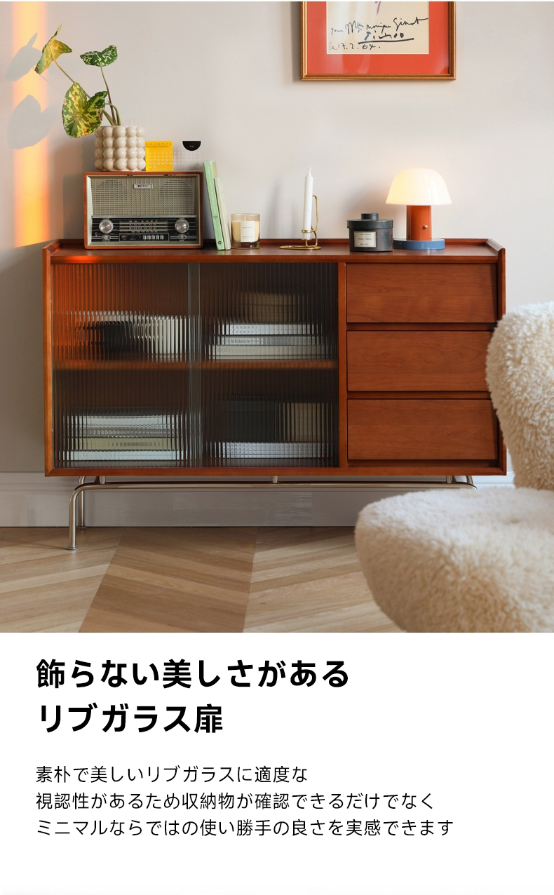 - 【優れた収納力と機能性】このキャビネットは、引き出しと扉付きの収納スペースを備え、食器や日用品をすっきりと整理できます。調整可能な棚板が付いており、収納物に合わせてカスタマイズ可能です。リブガラス扉により、収納物を簡単に確認でき、ミニマルな美しさを演出します。