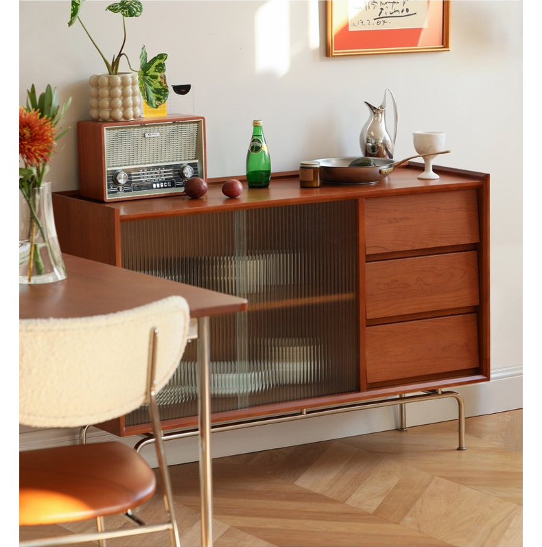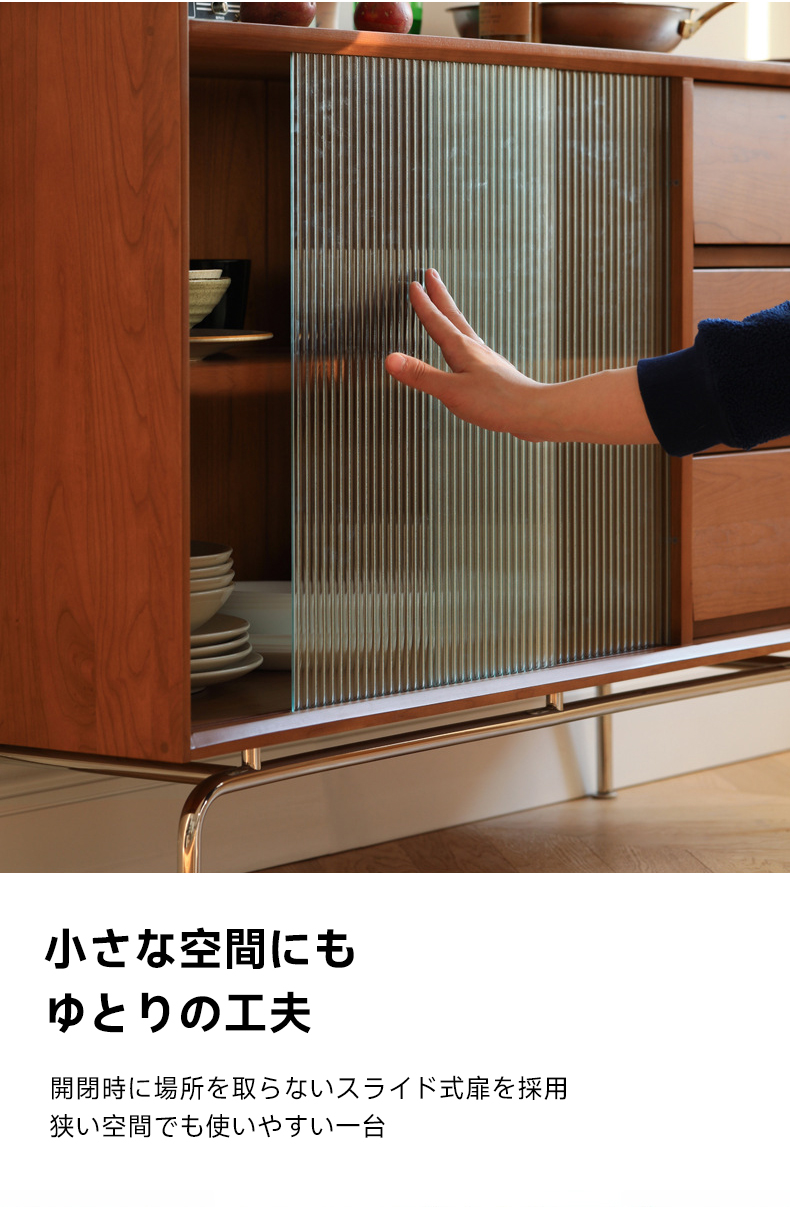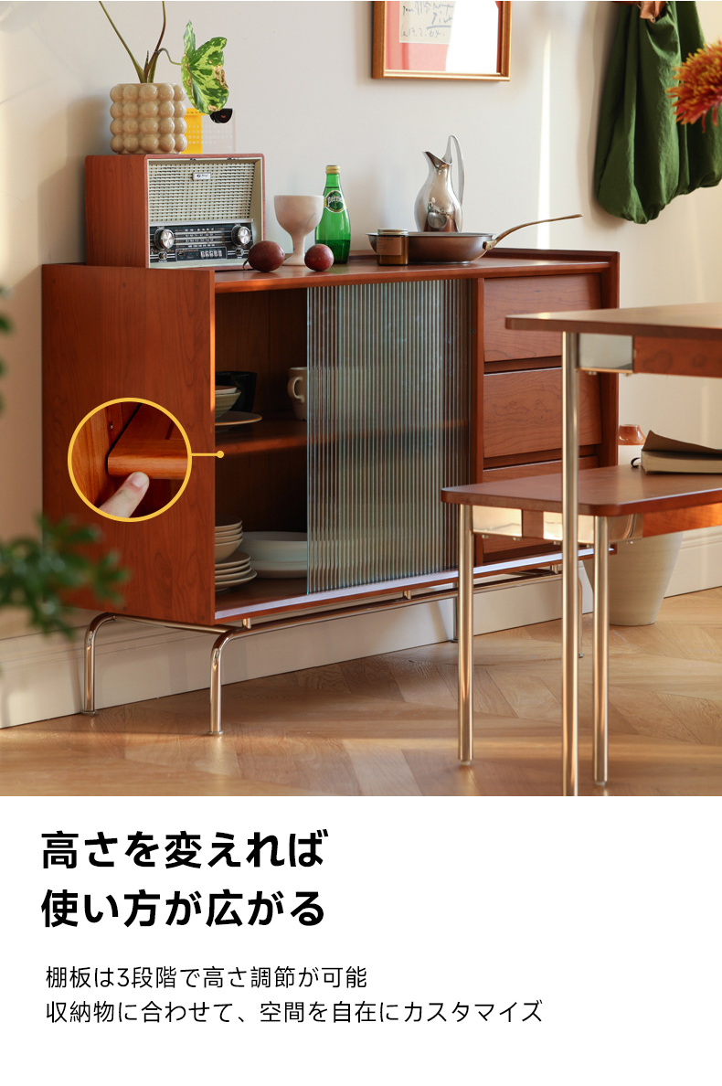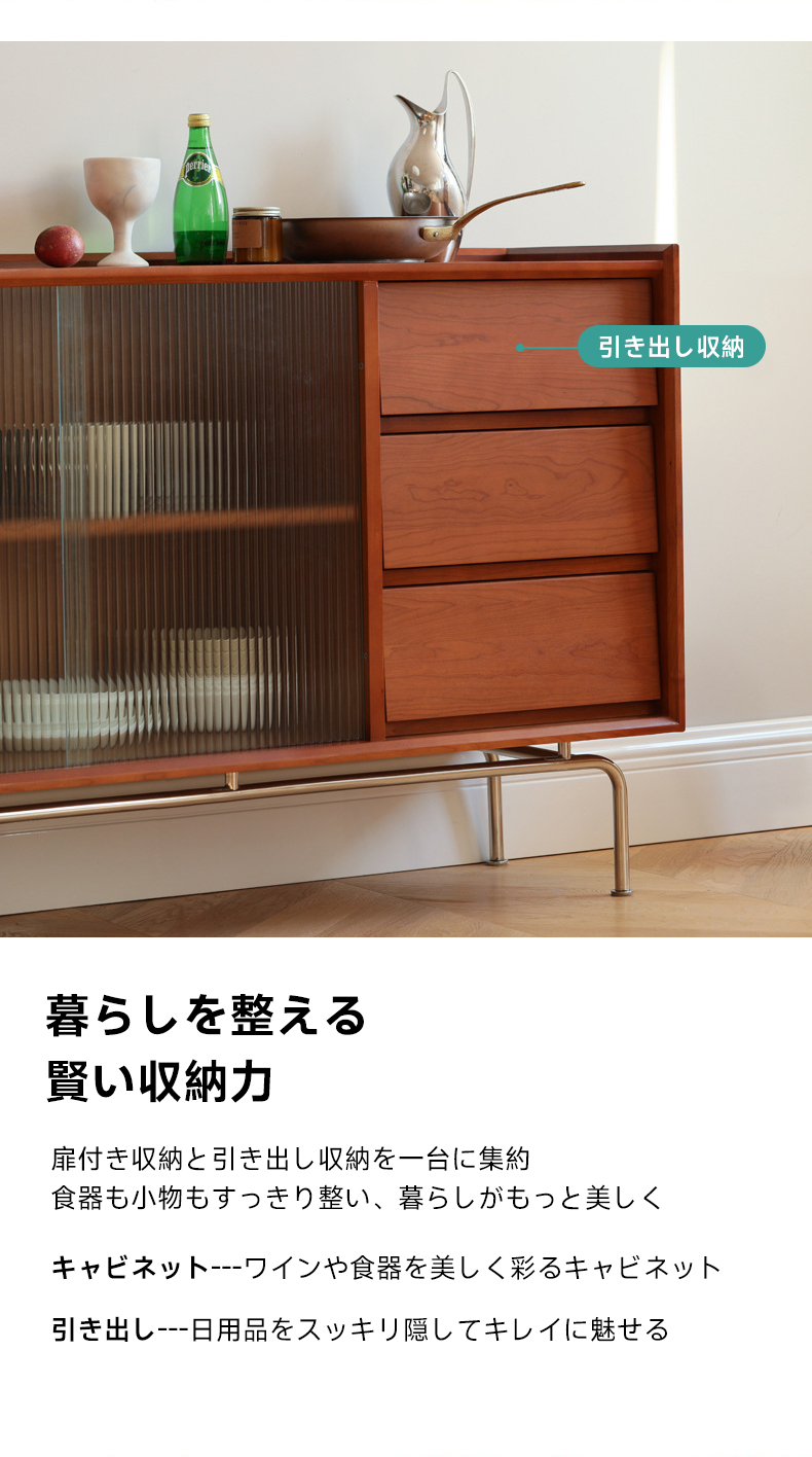 - 【優れた収納力と機能性】このキャビネットは、引き出しと扉付きの収納スペースを備え、食器や日用品をすっきりと整理できます。調整可能な棚板が付いており、収納物に合わせてカスタマイズ可能です。リブガラス扉により、収納物を簡単に確認でき、ミニマルな美しさを演出します。