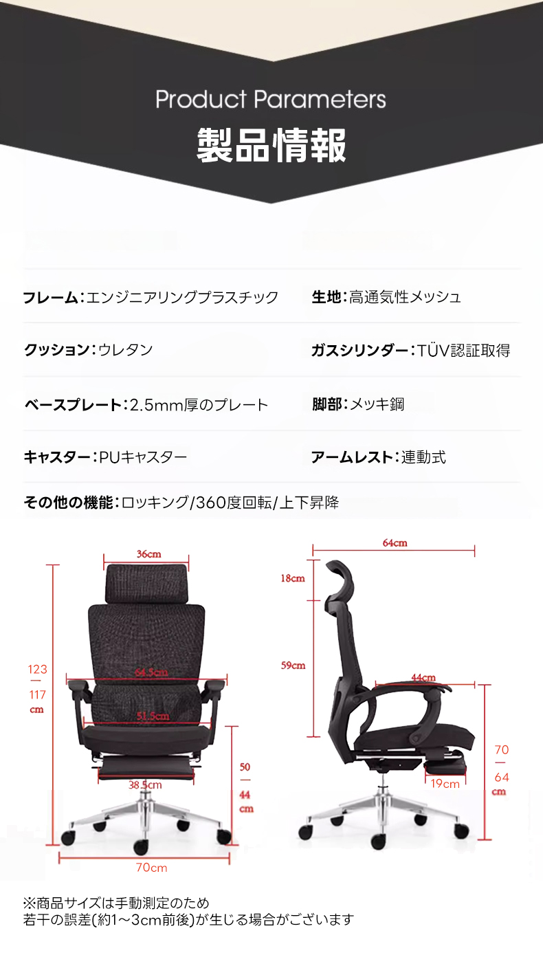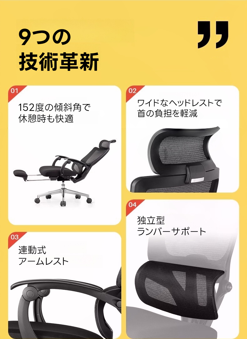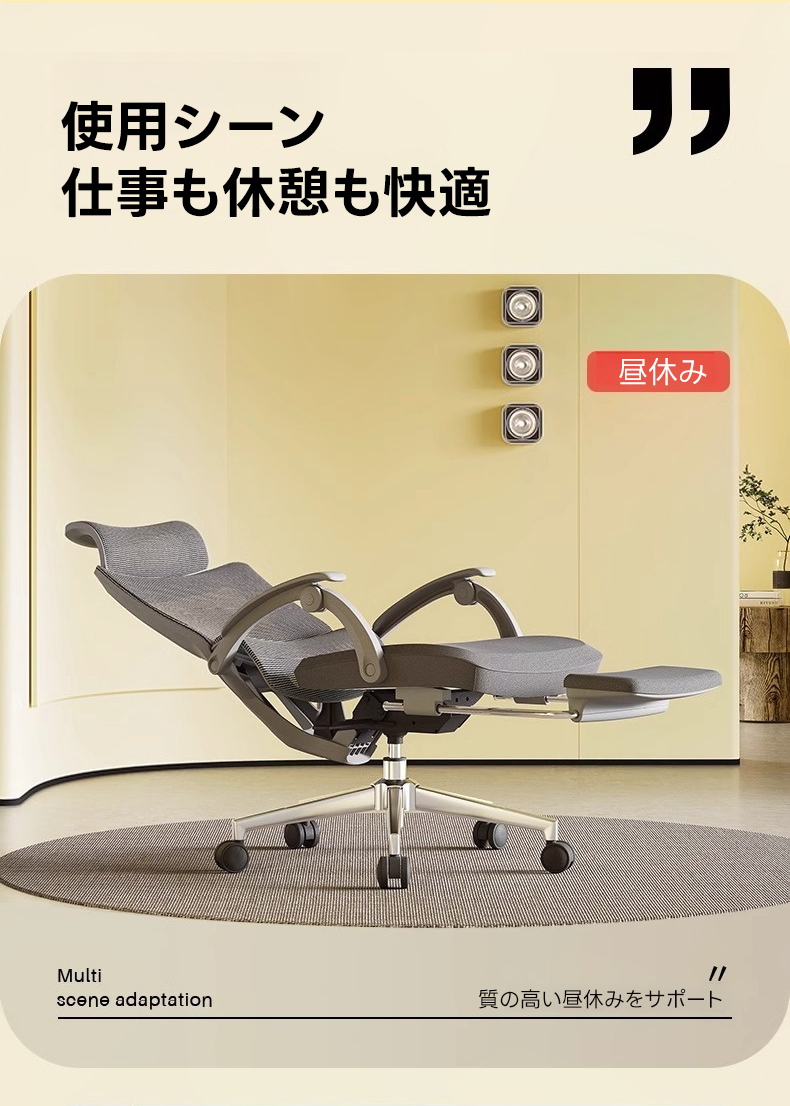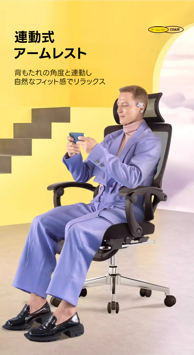 - 【リクライニング機能で快適な休憩】最大152度までリクライニング可能なデスクチェアで、ワンタッチでリラックスモードに移行できます。長時間の作業の合間に快適な休憩を提供します。