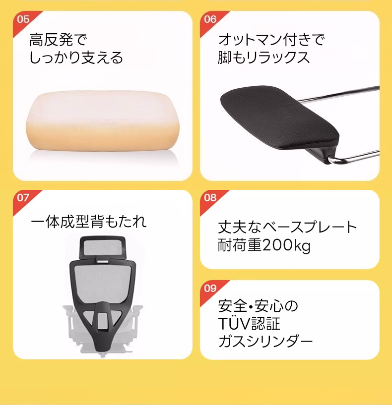 - 【高品質な素材とデザイン】通気性に優れたメッシュ素材と高反発ウレタンクッションを採用し、長時間座っても疲れにくい設計。頑丈なスチール脚で耐荷重200kgまで対応可能です。