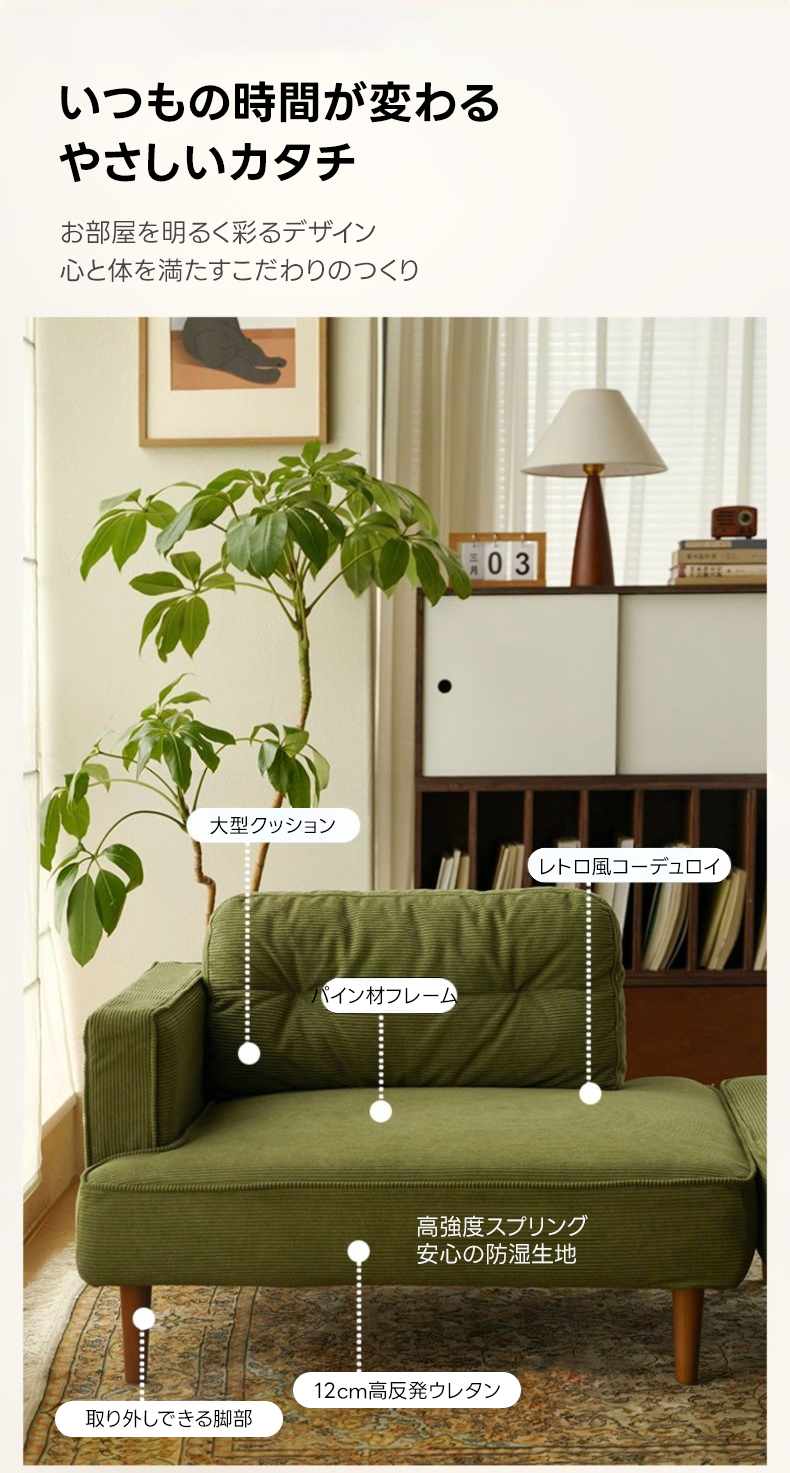 - 【高品質な素材とデザイン】フレームは耐久性に優れたパイン材を使用し、安定感があります。座面には12cmの高反発ウレタンを採用し、長時間座っても快適です。レトロ風のコーデュロイ生地は、耐水性と耐摩耗性に優れています。