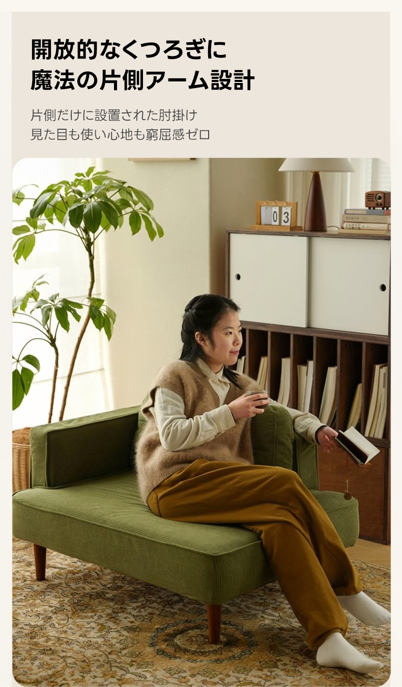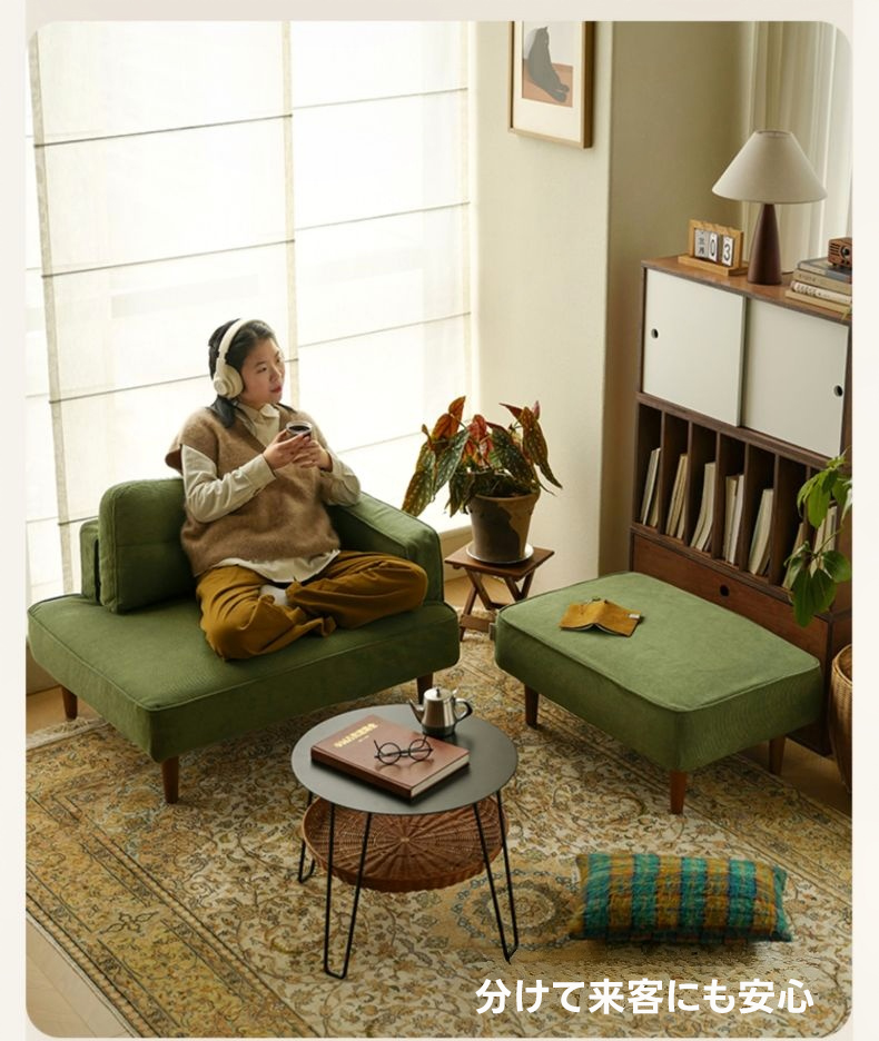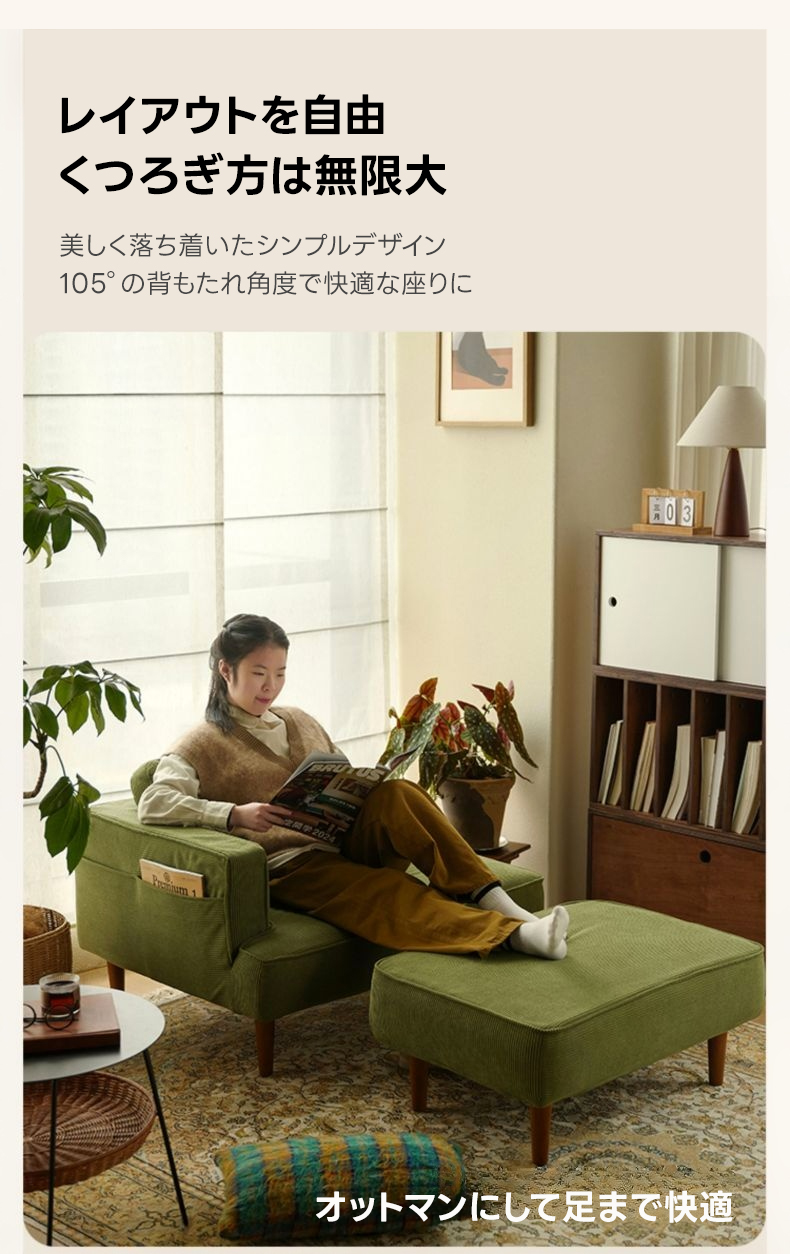 - 【多機能なコーデュロイコンパクトソファ】このソファは、北欧風のデザインで、リビングや寝室、書斎に最適です。片側アーム設計により、開放感があり自由なレイアウトが可能です。ソファとオットマンを組み合わせて、リラックスしたり分けて使用することもできます。
