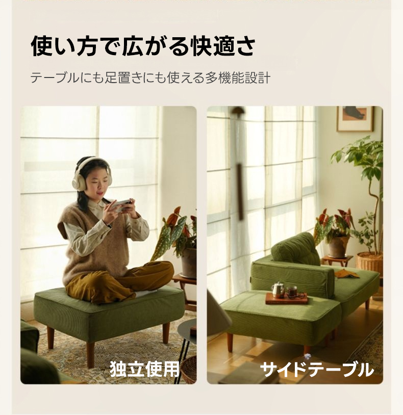 - 【適用シーンと利便性】一人暮らしやカップル、ファミリーに向けた多機能性を備えています。サイドポケットが付いており、リモコンや雑誌の収納に便利です。脚部は取り外し可能で、床置きスタイルにも対応します。