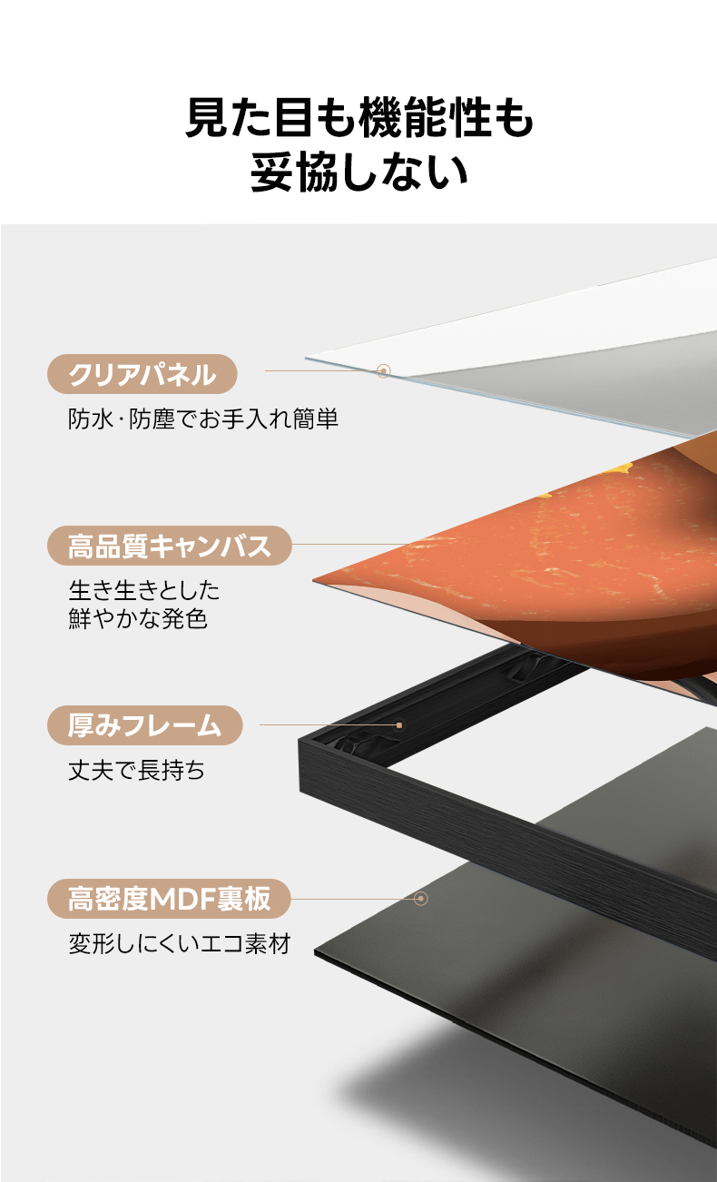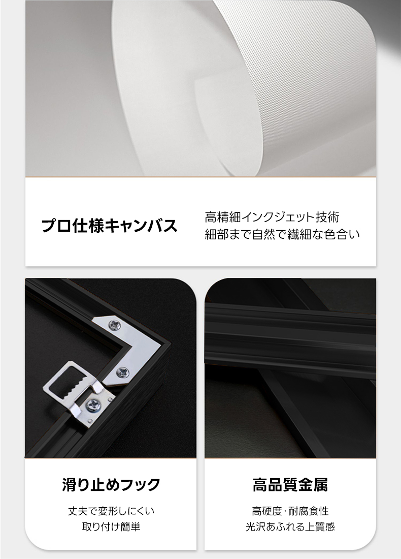 - 【高品質な素材と優れた耐久性】アルミ合金フレームは防湿性・耐腐食性に優れ、長期間にわたって美しさを保ちます。クリアパネルは防水・防塵で、お手入れも簡単です。プロ仕様キャンバスと高精細インクジェット技術により、自然で繊細な色合いを実現します。