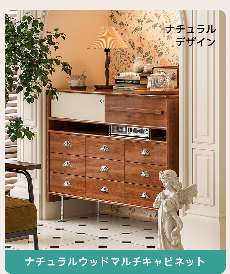 - 【ヴィンテージ感漂うデザインと実用性】このナチュラルウッドマルチキャビネットは、ヴィンテージ感漂うデザインと実用性を兼ね備えています。リビングや寝室での使用に最適で、幅広いインテリアスタイルに自然に溶け込みます。