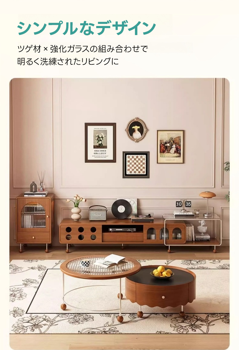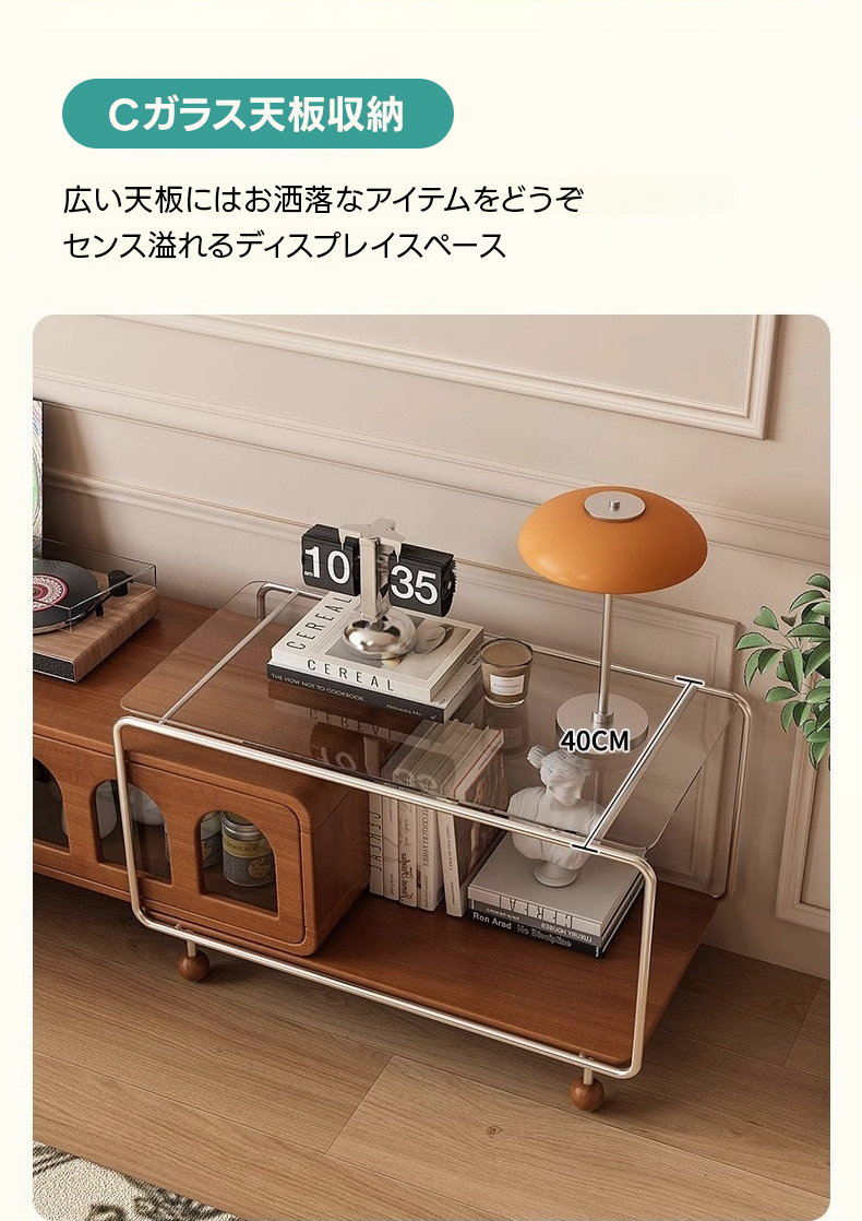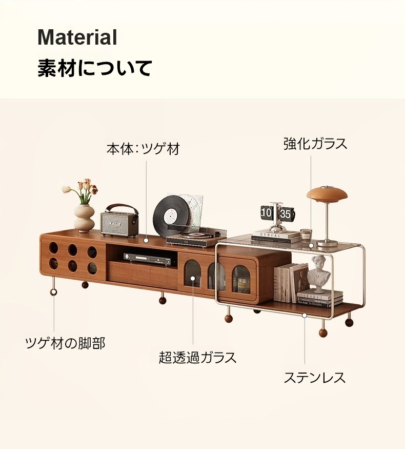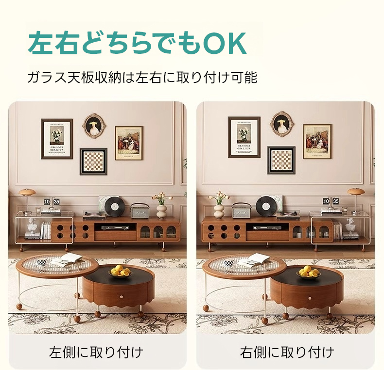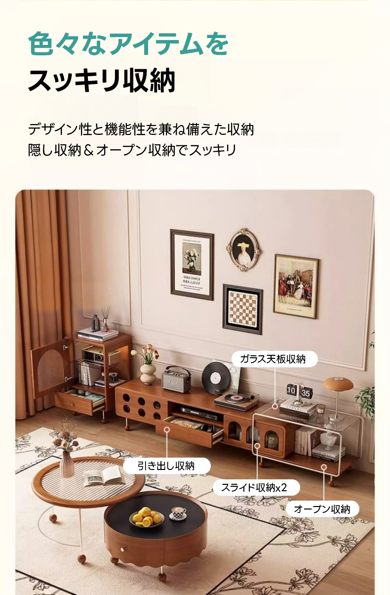 - 【多様な収納オプション】スライド式と引き出し式の収納スペースを備え、リモコンや雑誌などをすっきりと整理できます。ガラス天板収納はディスプレイスペースとしても利用可能で、インテリアをより魅力的に演出します。