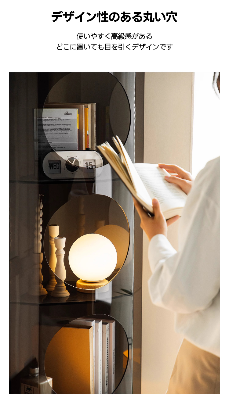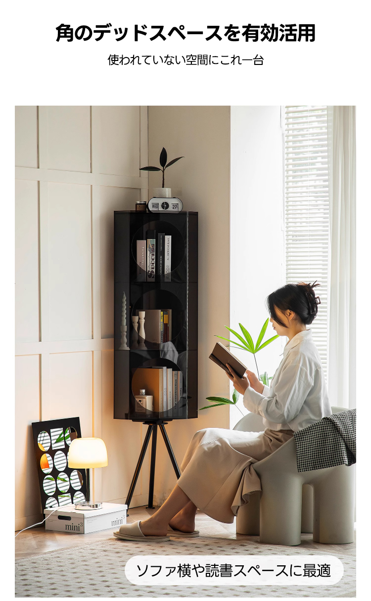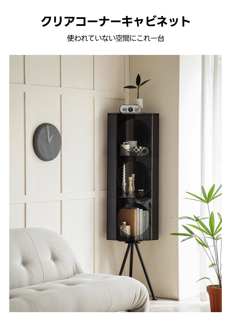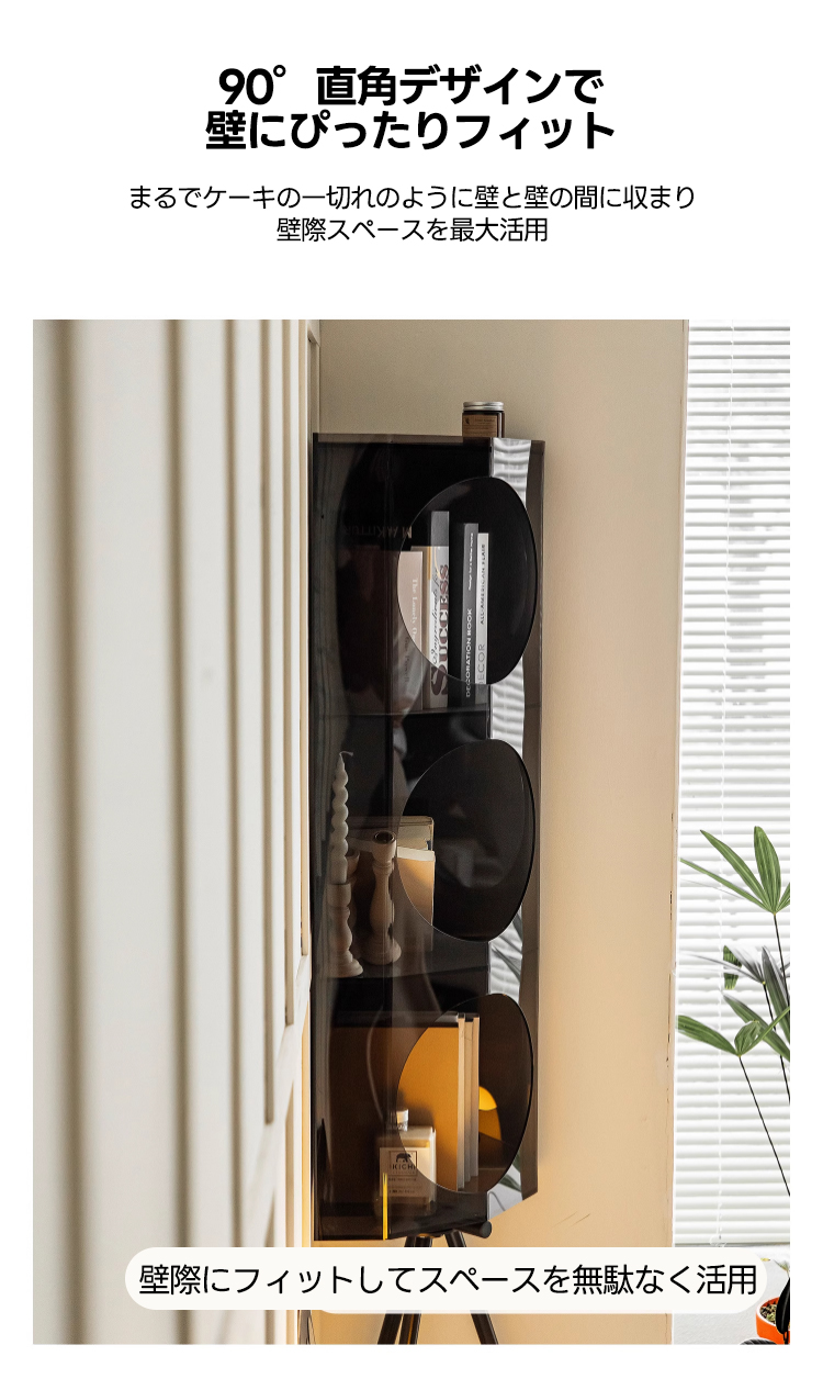 - 【未使用の角スペースを有効活用】MonoLucentクリアコーナーキャビネットは、未使用の角スペースを最大限に活用するために設計されています。丸い穴のデザインが特徴で、ワインやフィギュア、本などをすっきりと収納可能です。