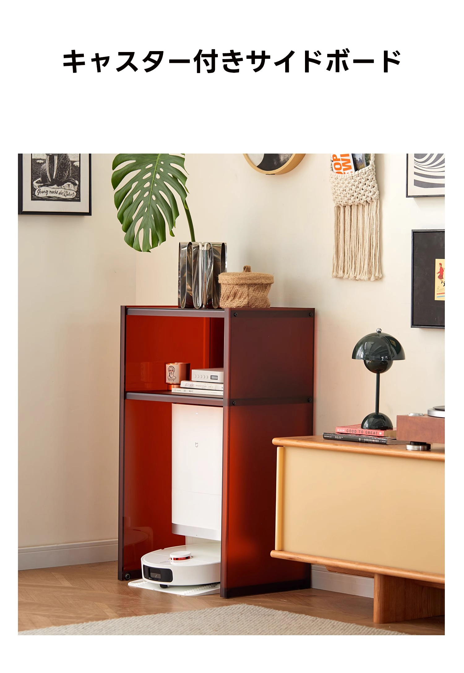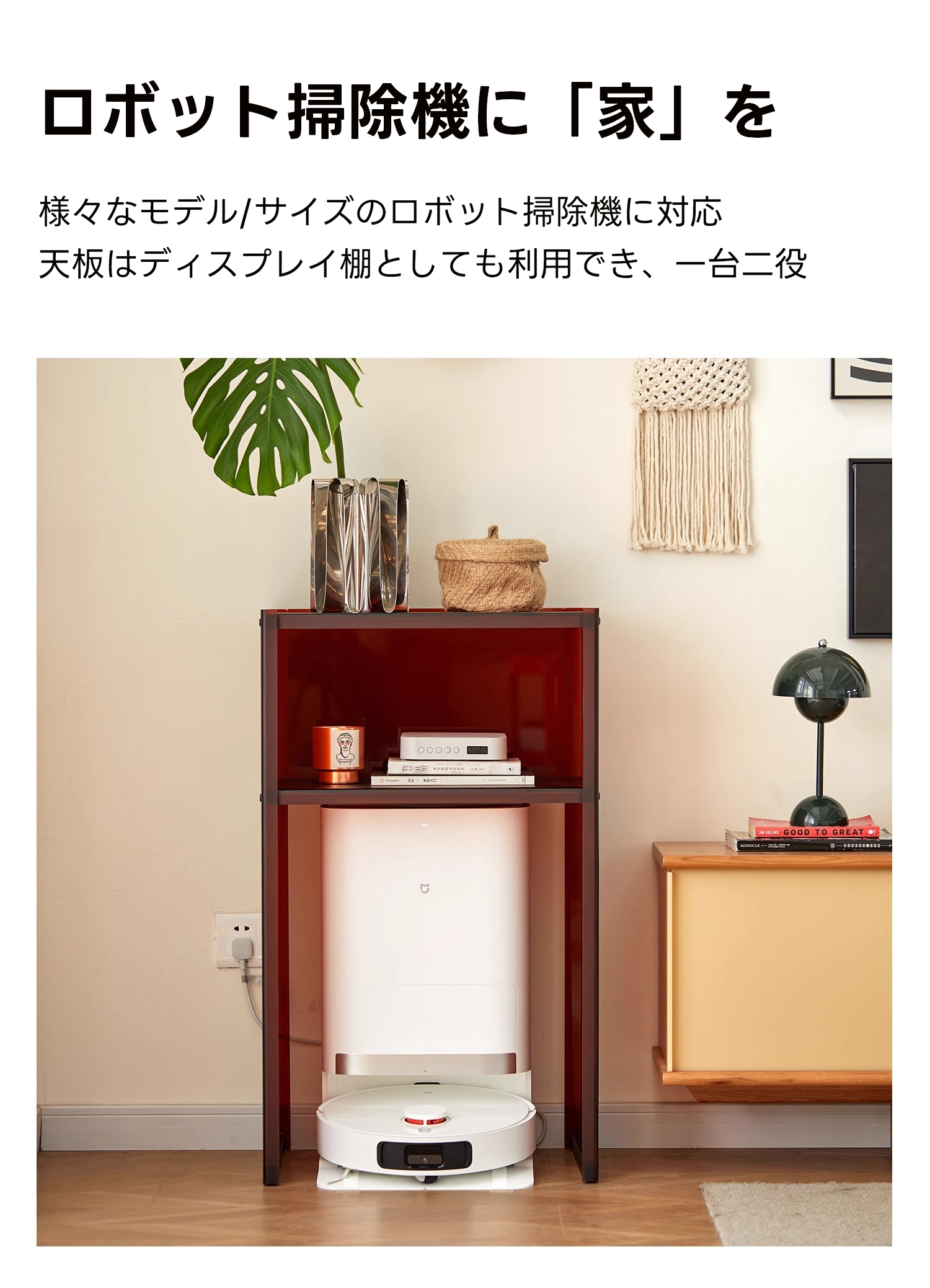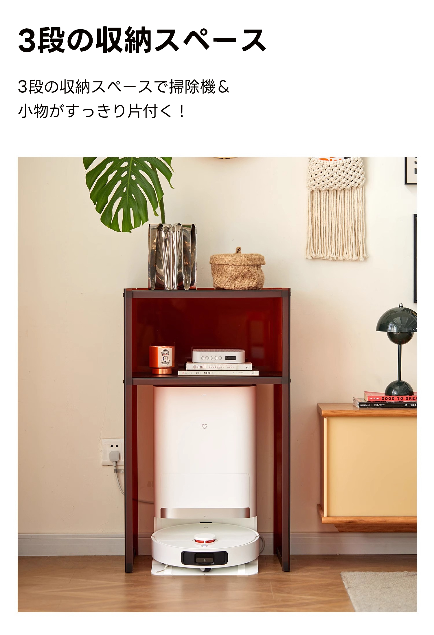 - 【多機能収納スペース】3段の収納スペースを備えたロボット掃除機収納キャビネットは、小物や雑誌もすっきりと片付けられます。天板はオープンデザインで、ディスプレイ棚としても活用可能です。