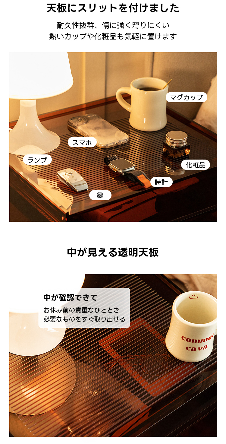 - 【便利な収納機能】引き出し付きで、小物や化粧品、ケーブル類の収納に便利です。天板にはスリットが施されており、滑りにくく、熱いカップや化粧品も安心して置けます。落下防止設計で、大切な物をしっかりと守ります。