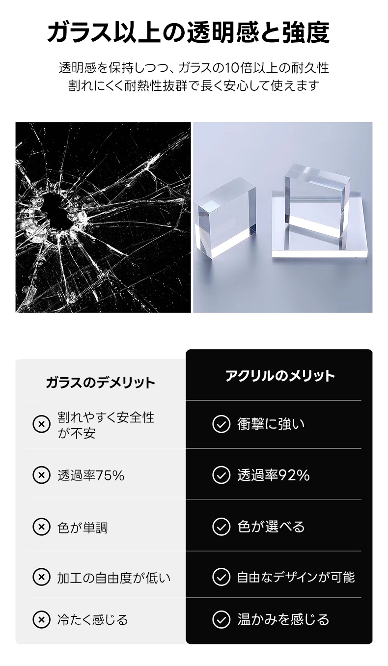 - 【高品質な素材と優れた耐久性】8mm厚の高品質アクリルを使用し、透明度92%を誇ります。軽量でありながら耐衝撃性に優れ、長期間にわたって美しさを保ちます。変色しにくく、日常使いに最適です。