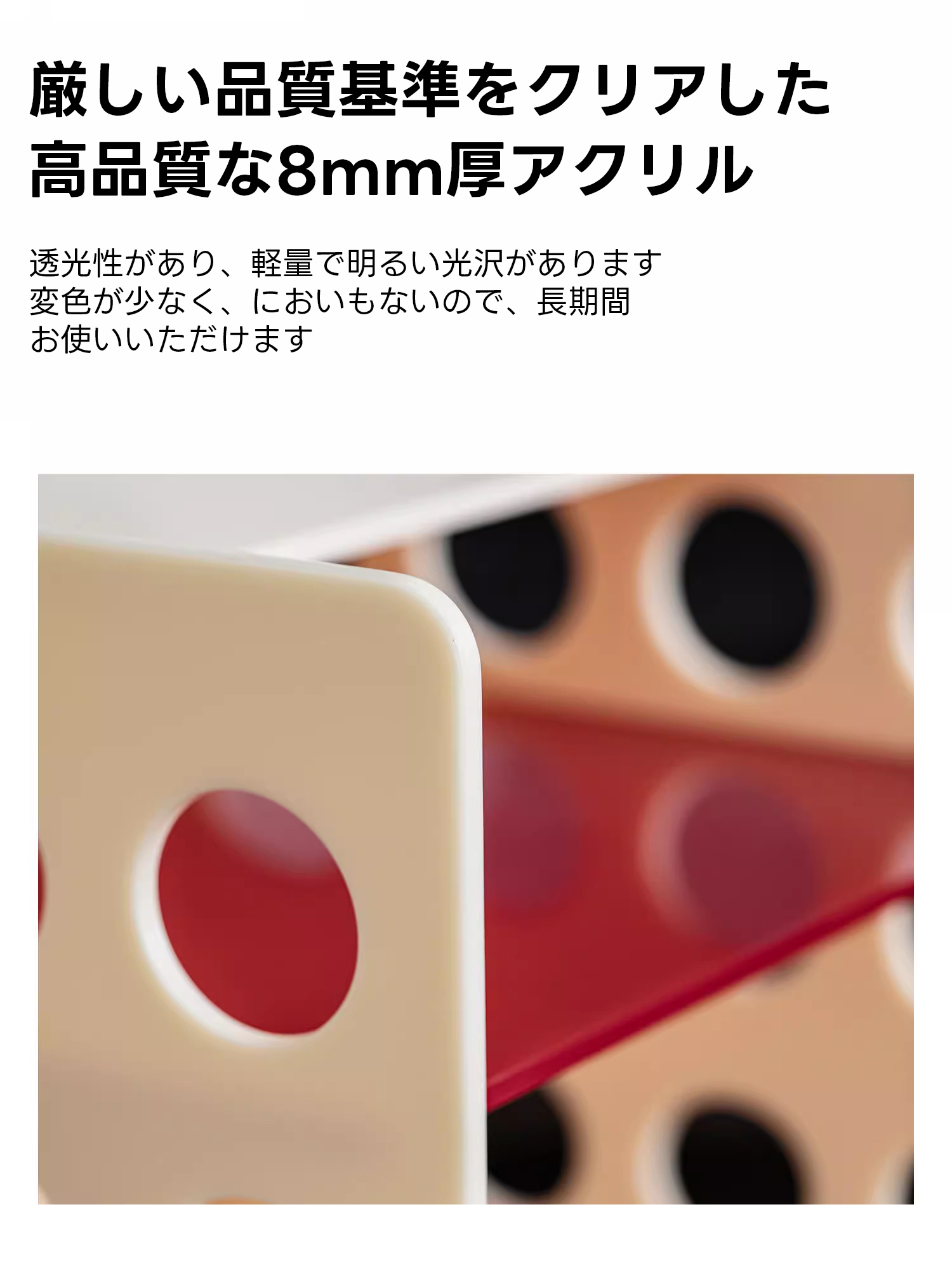 - 【高品質な素材とデザイン】カラーアクリル素材を使用し、透明感と耐久性を兼ね備えています。厚さ8mmのアクリルは、ガラスのような美しい光沢を持ちつつ、割れにくく長期間使用可能です。丸穴が施されたユニークな外観がどんなインテリアにもマッチします。