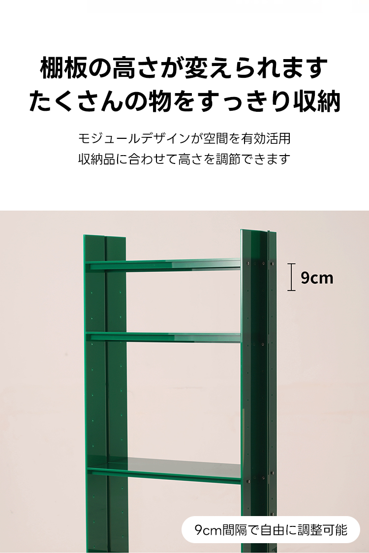 - 【調整可能な棚板】モジュールデザインにより、棚板の高さを自由に調整でき、収納品に合わせて効率的に空間を活用できます。書籍やインテリア小物をすっきりと収納可能で、整理整頓が簡単です。