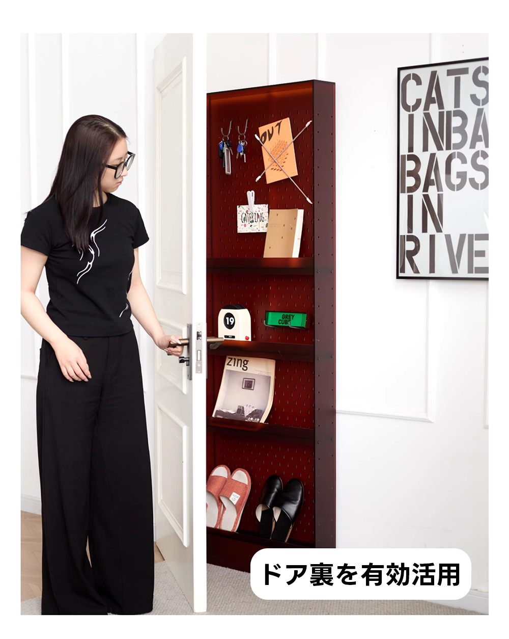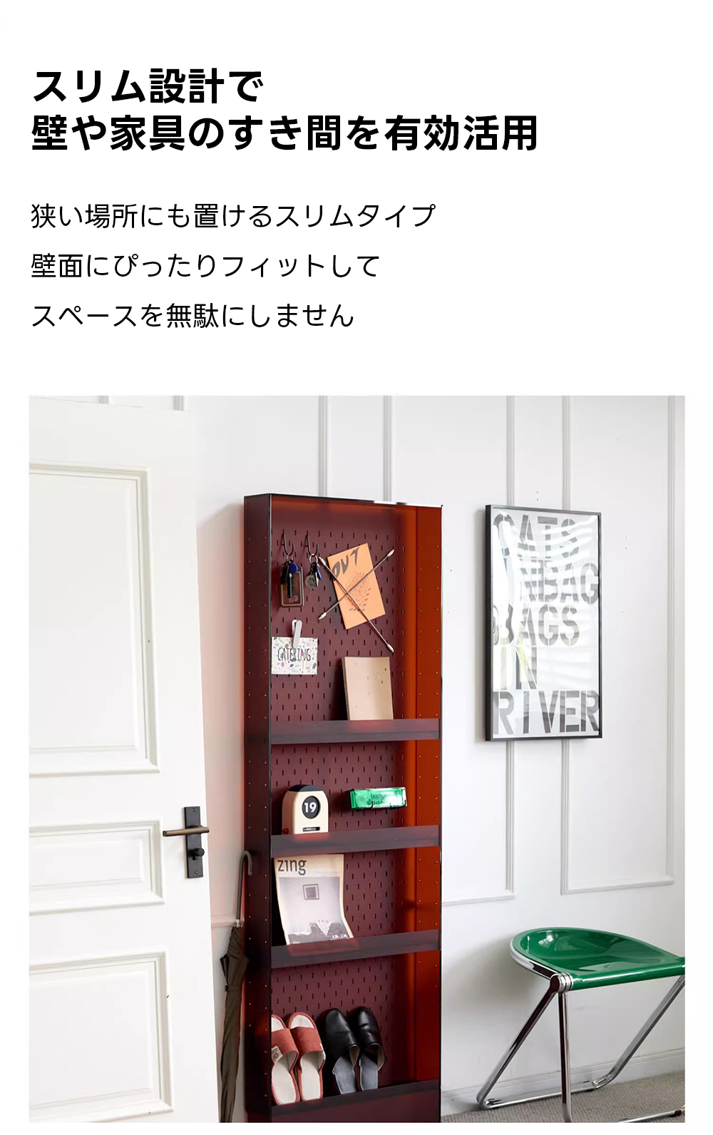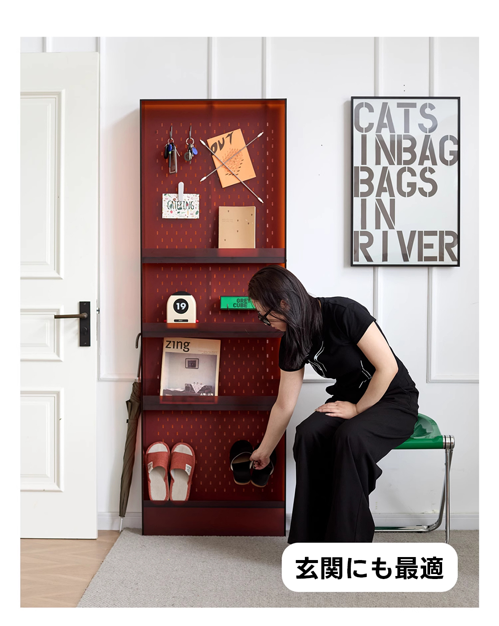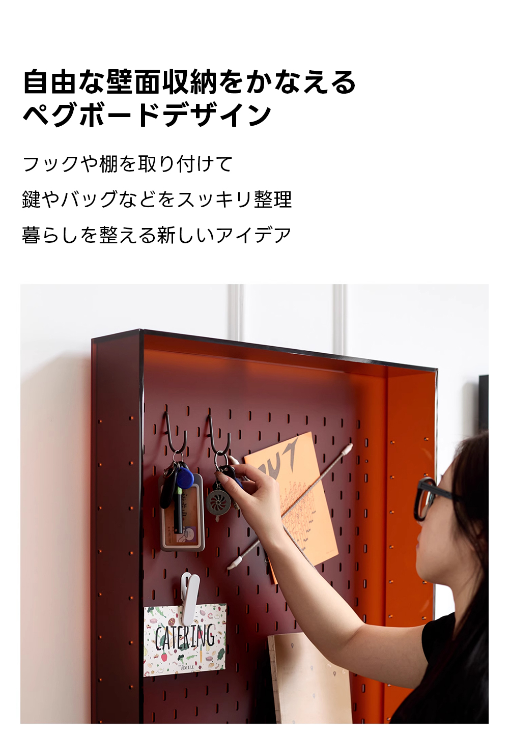 - 【カスタマイズ可能な収納】棚の高さは自由に調整可能で、収納するものに合わせてカスタマイズが可能です。ペグボードデザインにより、フックや棚を追加して鍵やバッグを整理整頓できます。