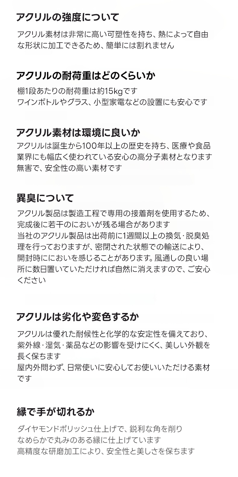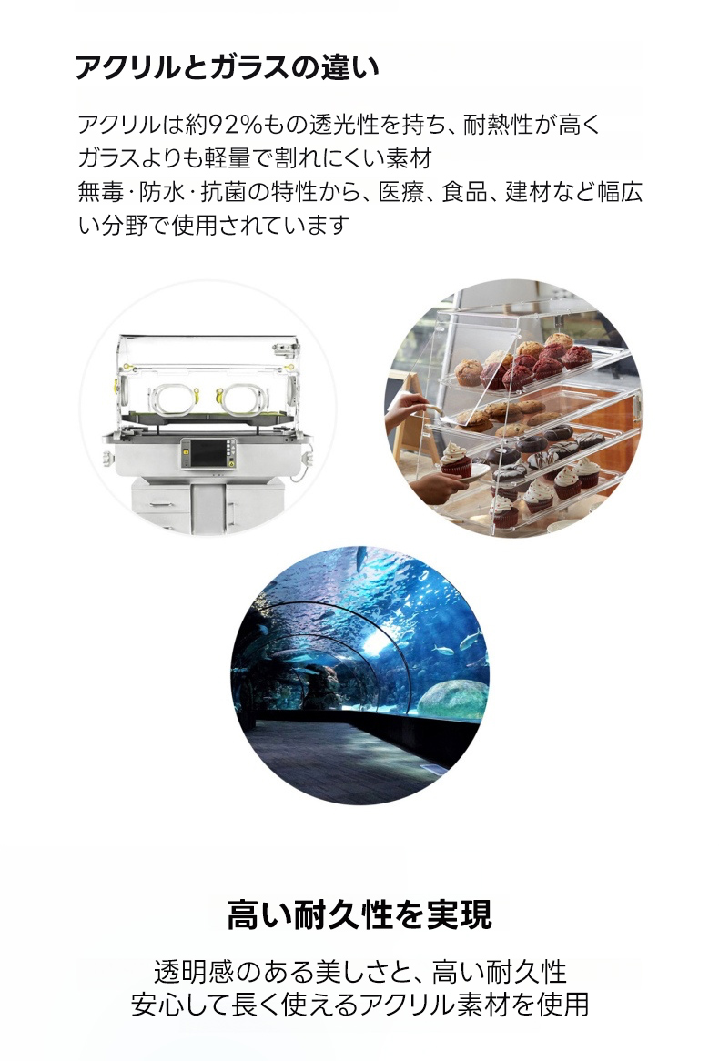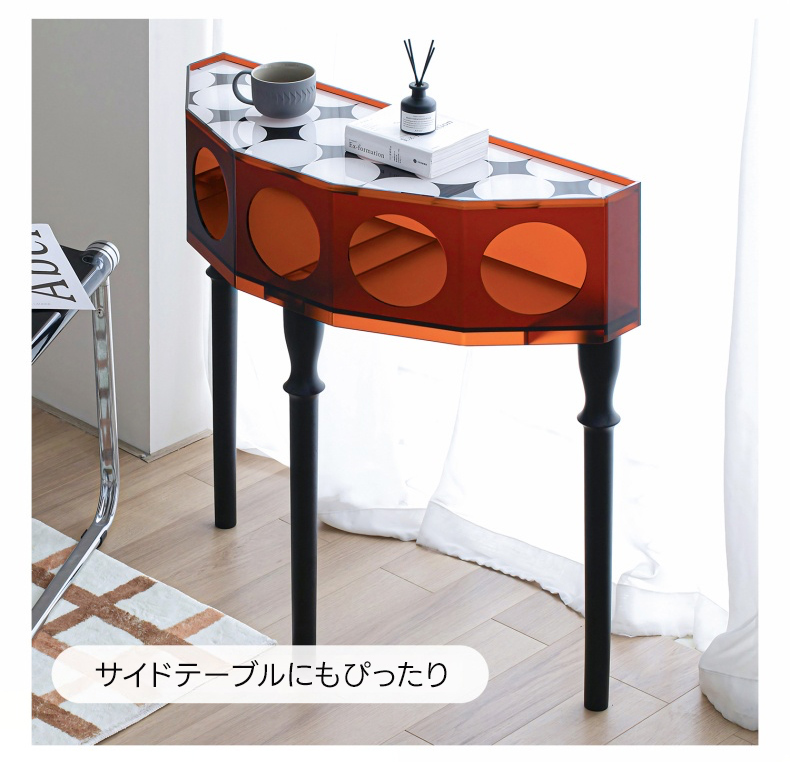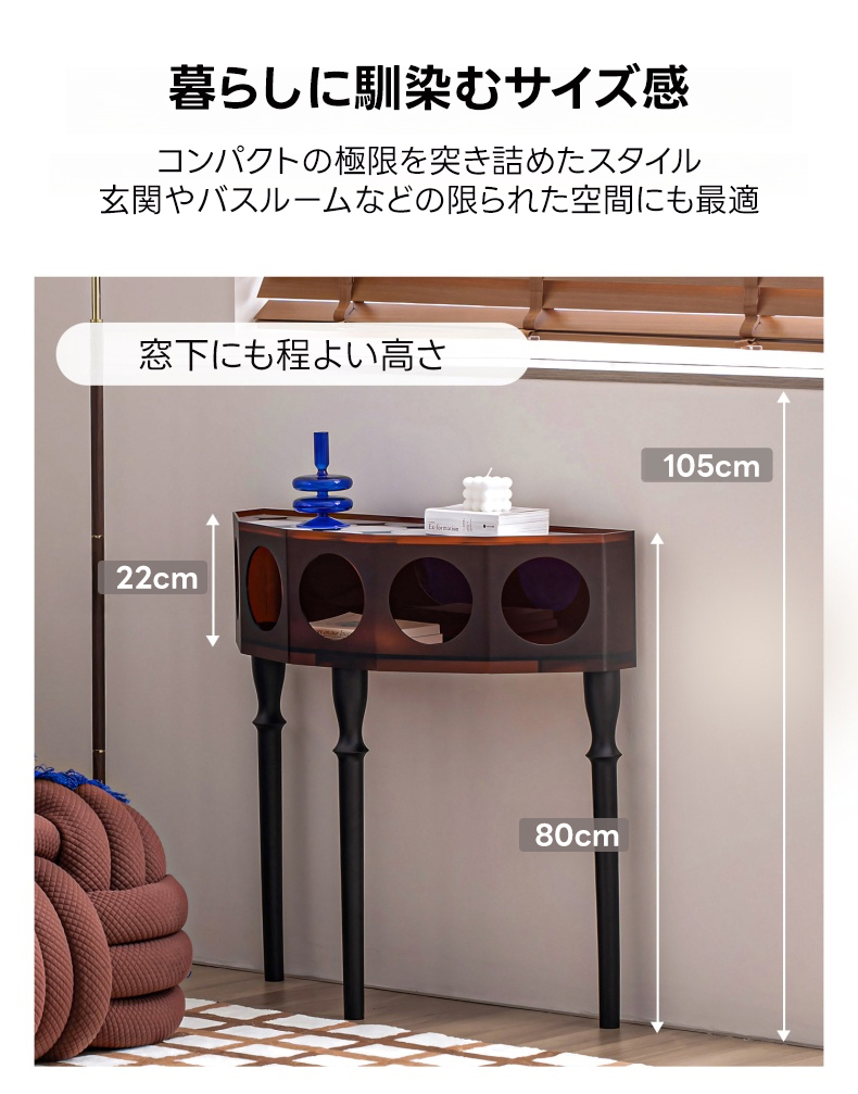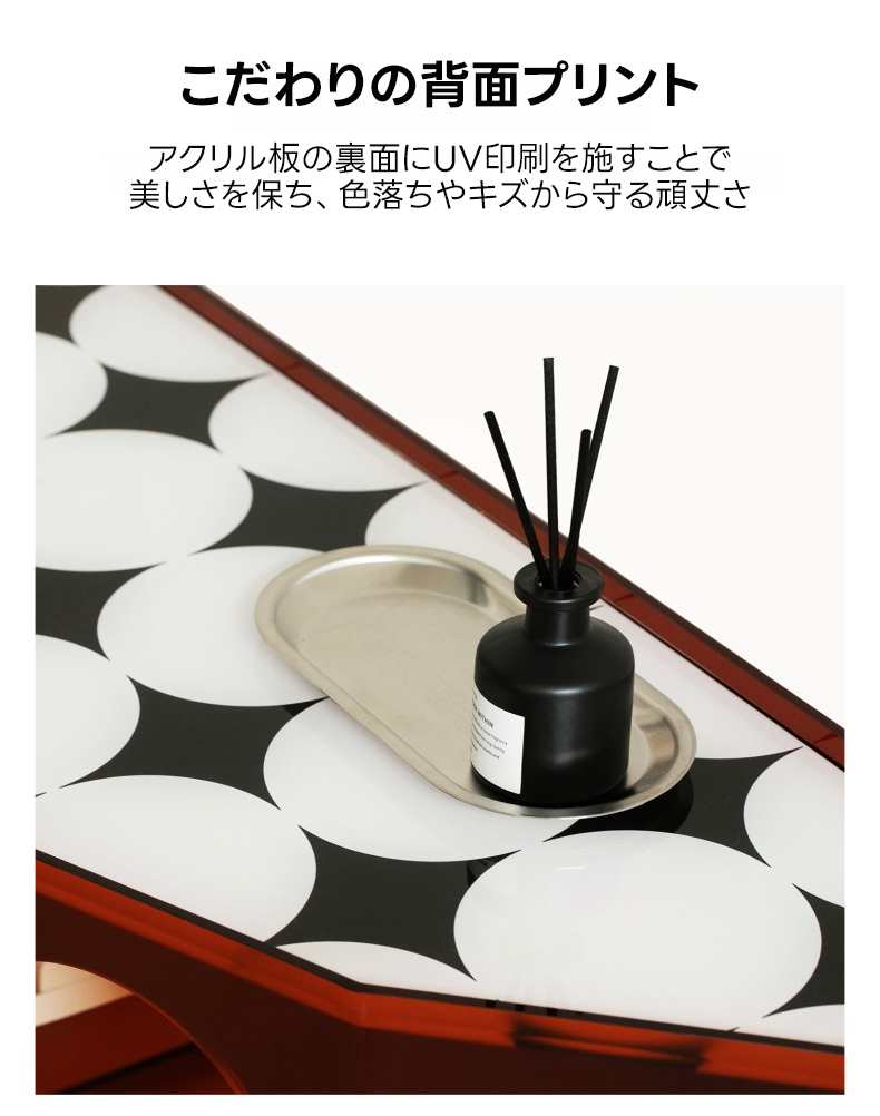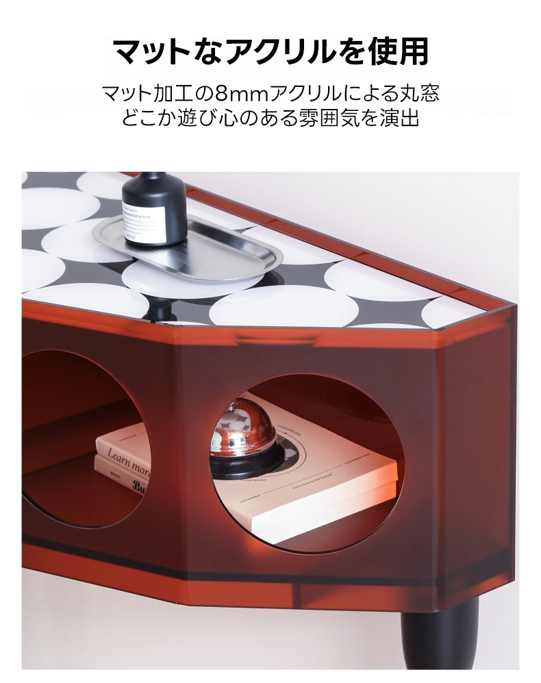 - 【高品質な素材とデザイン】:マット加工された8mmのアクリルが使用され、丸窓が遊び心のある雰囲気を演出します。背面にはUV印刷が施されており、美しさを保ちながら色落ちやキズから守ります。脚部にはマット塗装のラバーウッドを使用しており、壁に寄せずとも安定した使い心地を提供します。