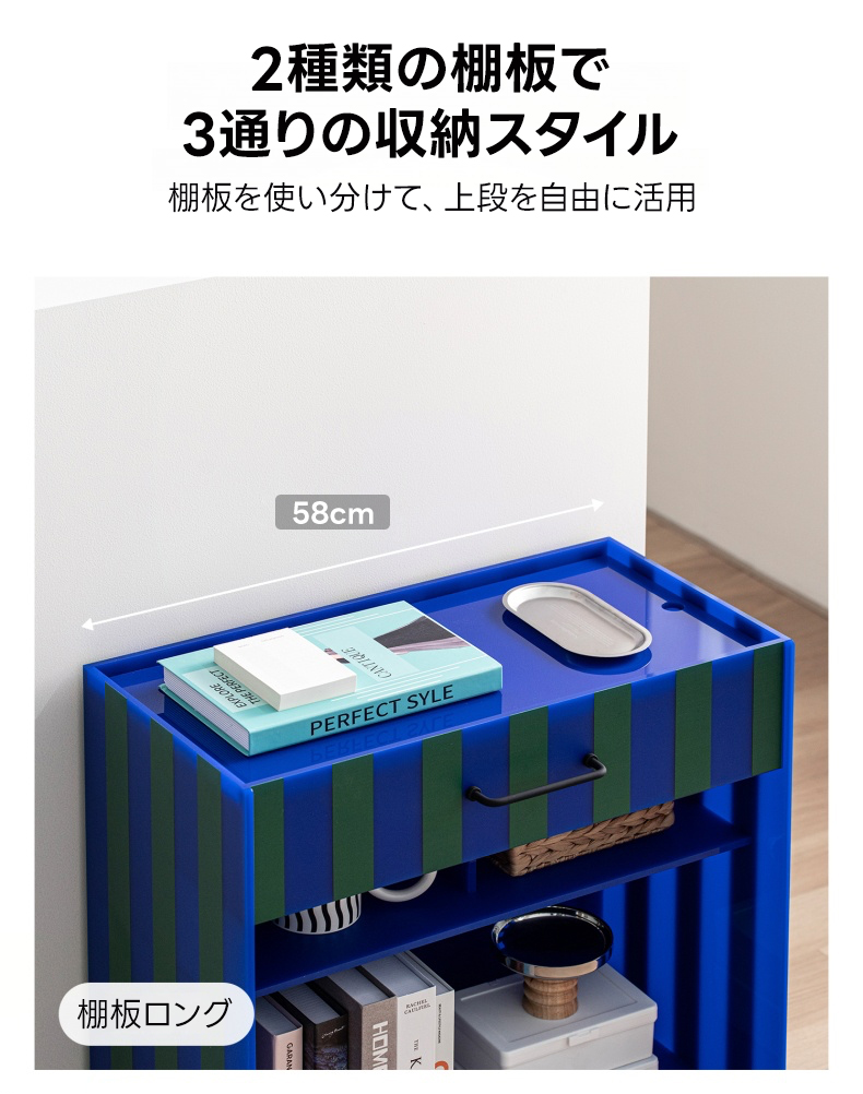 - 【安心の使用体験】:なめらかなフォームで手を傷つけない安心設計。棚板は2種類あり、3通りの収納スタイルを楽しむことができます。上段は自由に活用でき、収納スペースを最大限に活用可能です。